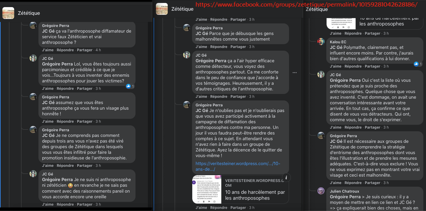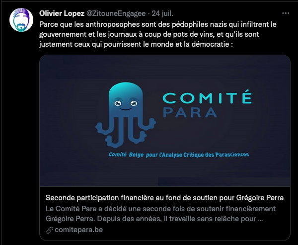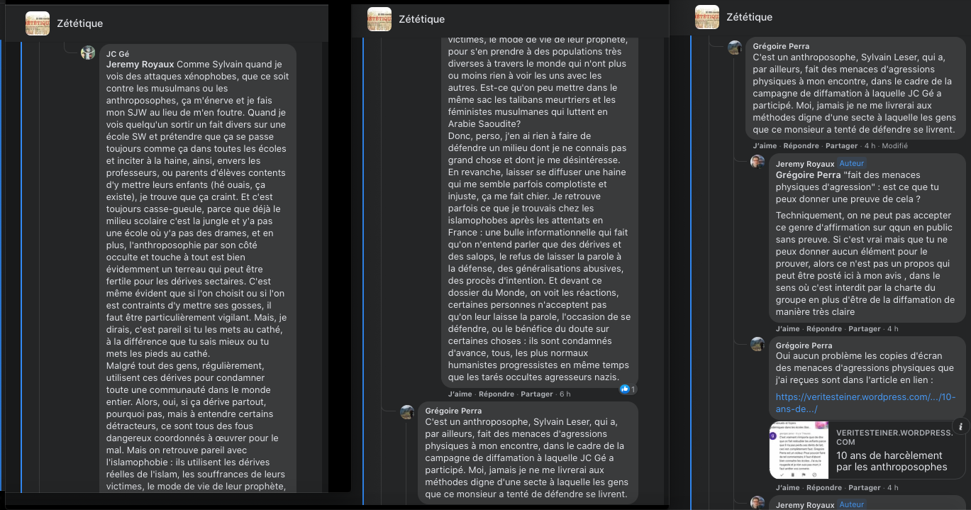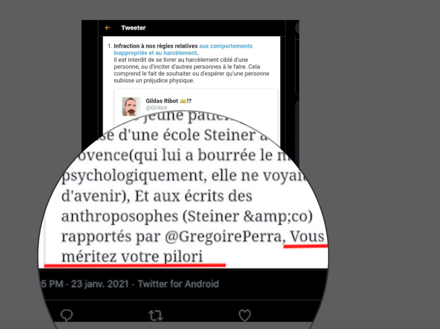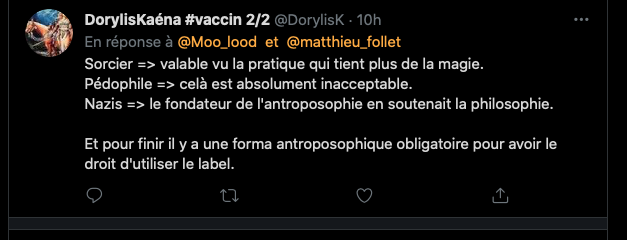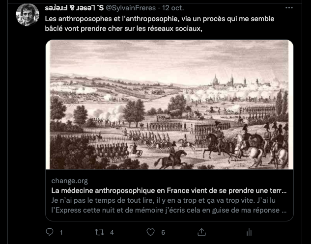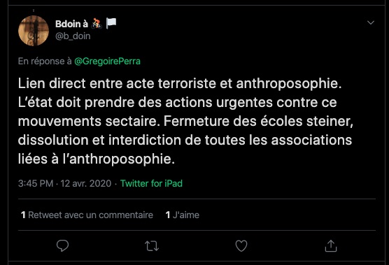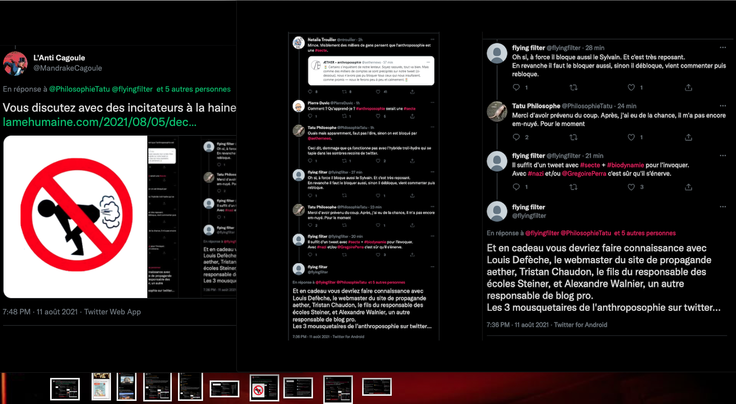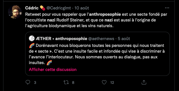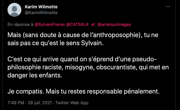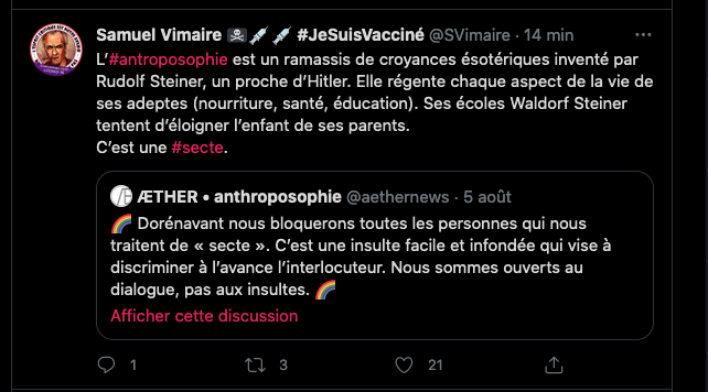 Citer le Tweet https://twitter.com/SylvainFreres/status/1431429146337583105?s=20 & Vous trainez depuis un paquet de temps là, sur le sujet de l’anthroposophie avec des personnes qui insultent, diffament, font et encouragent des menaces graves de représailles physiques envers les proches. Racontent des mensonges éhontées, calomnient qui essayent de nuire⬇︎ https://twitter.com/SylvainFreres/status/1429212166725451783?s=20 https://twitter.com/SylvainFreres/status/1436867938779283458?s=20 & etc. etc.