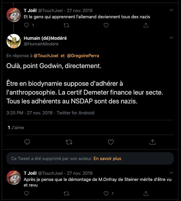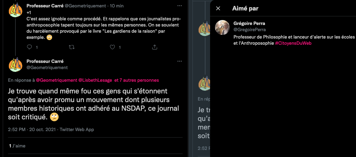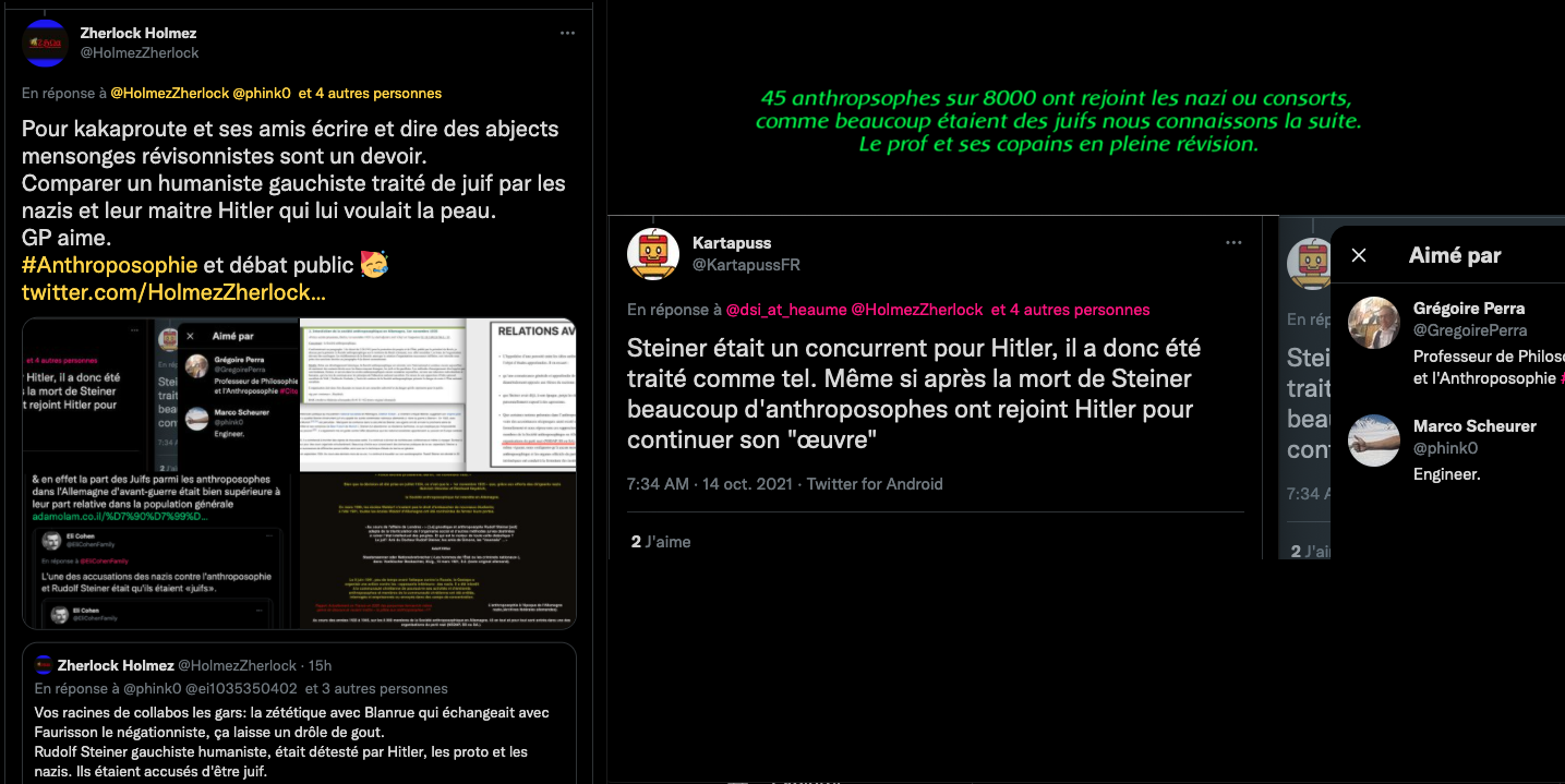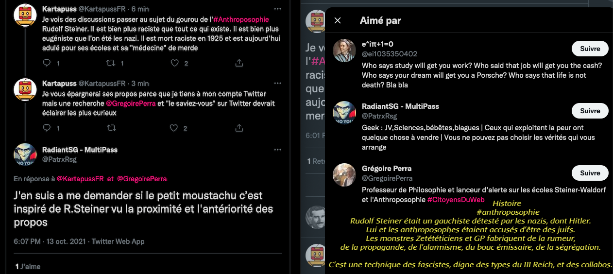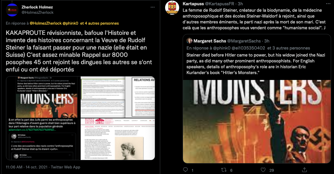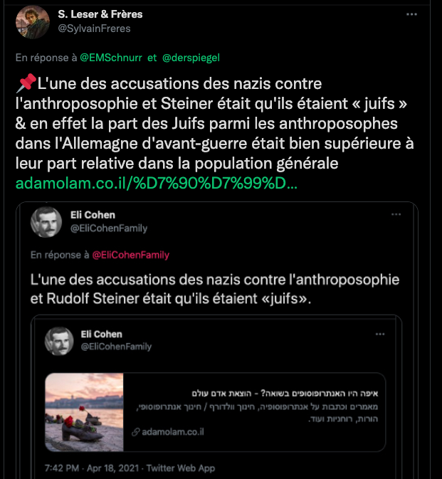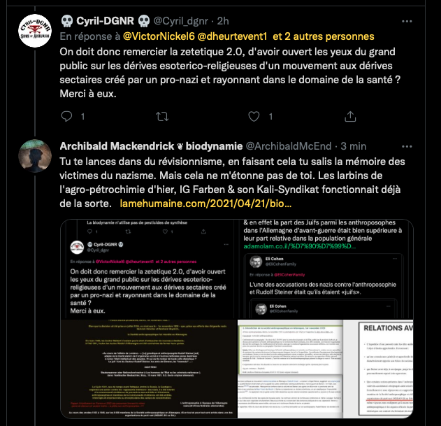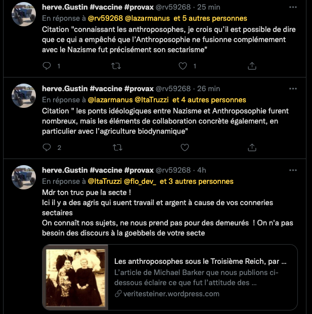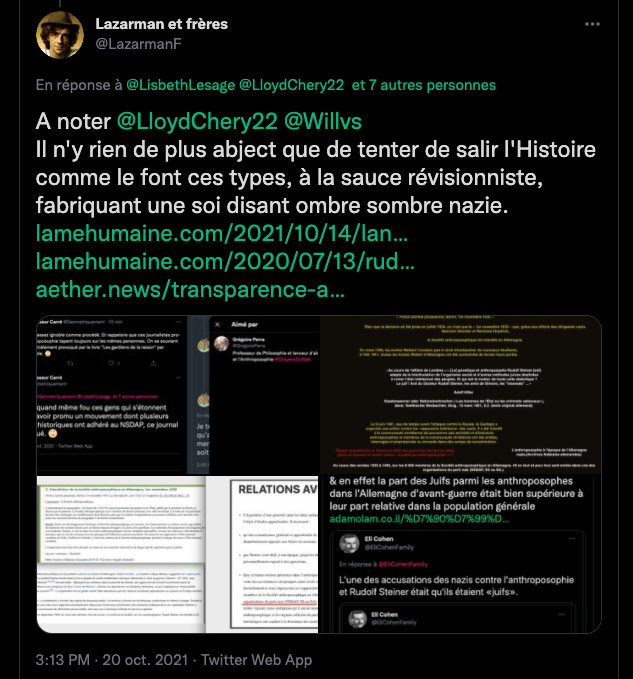 Voici un exemple de la propagande et de la rumeur infecte de la bande à machin ⤦ https://twitter.com/EliCohenFamily/status/1448324545262374916?s=20 – Les grouillots de la zététique fan d’agro-pétrochimie BASF, BAYER, MONSATAN et consorts pestilentielles, les proches de GP, tentent de faire passer la biodynamie et l’anthroposophie pour raciste, ils oublient leurs passés et leurs présents : https://twitter.com/LaFactur/status/1448360773894430726?s=20 & https://twitter.com/LaFactur/status/1448369154608795649?s=20 – Pour kakaproute et ses amis écrire et dire des abjects mensonges révisonnistes sont un devoir. Comparer un humaniste gauchiste traité de juif par les nazis et leur maitre Hitler qui lui voulait la peau. GP aime. #Anthroposophie et débat public