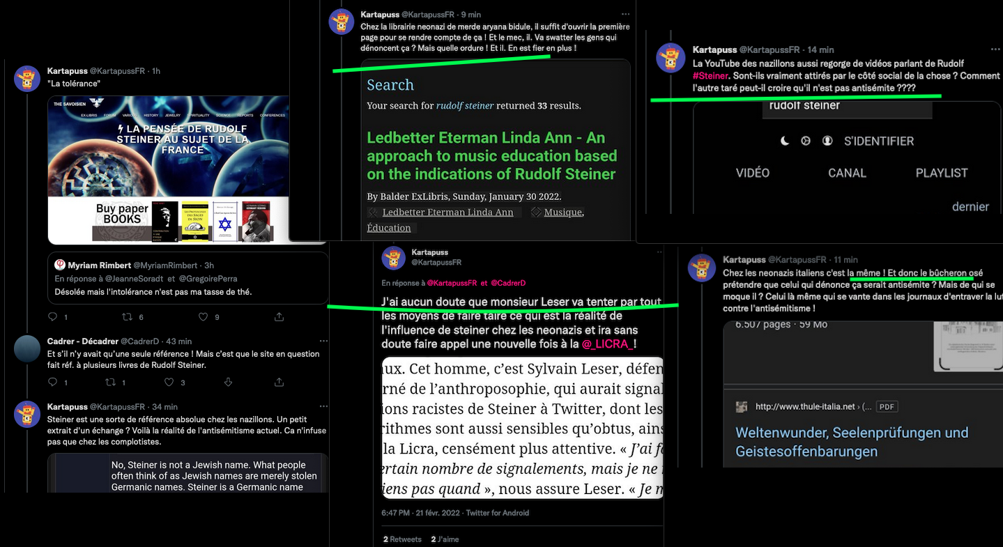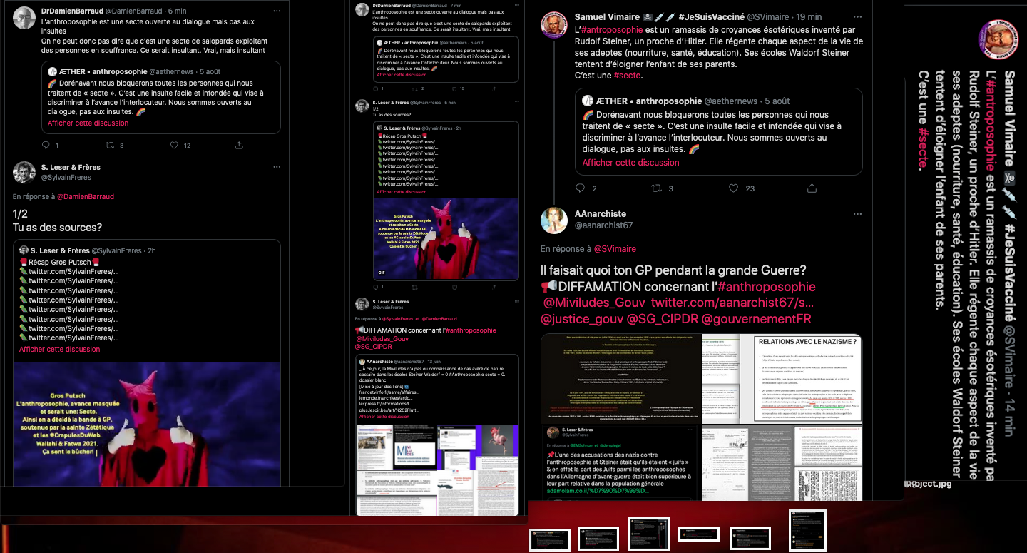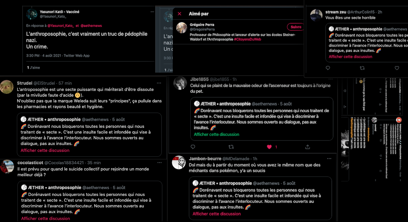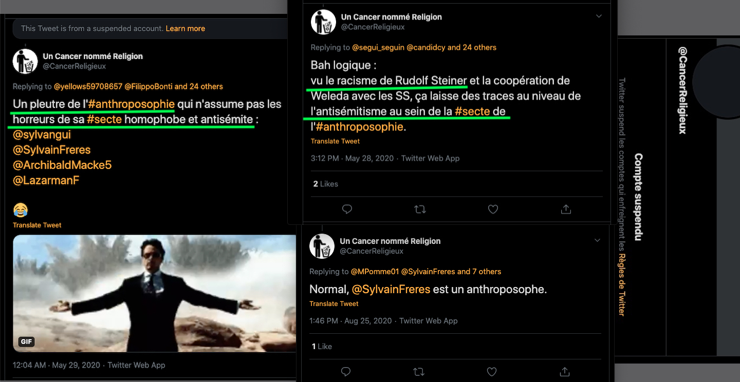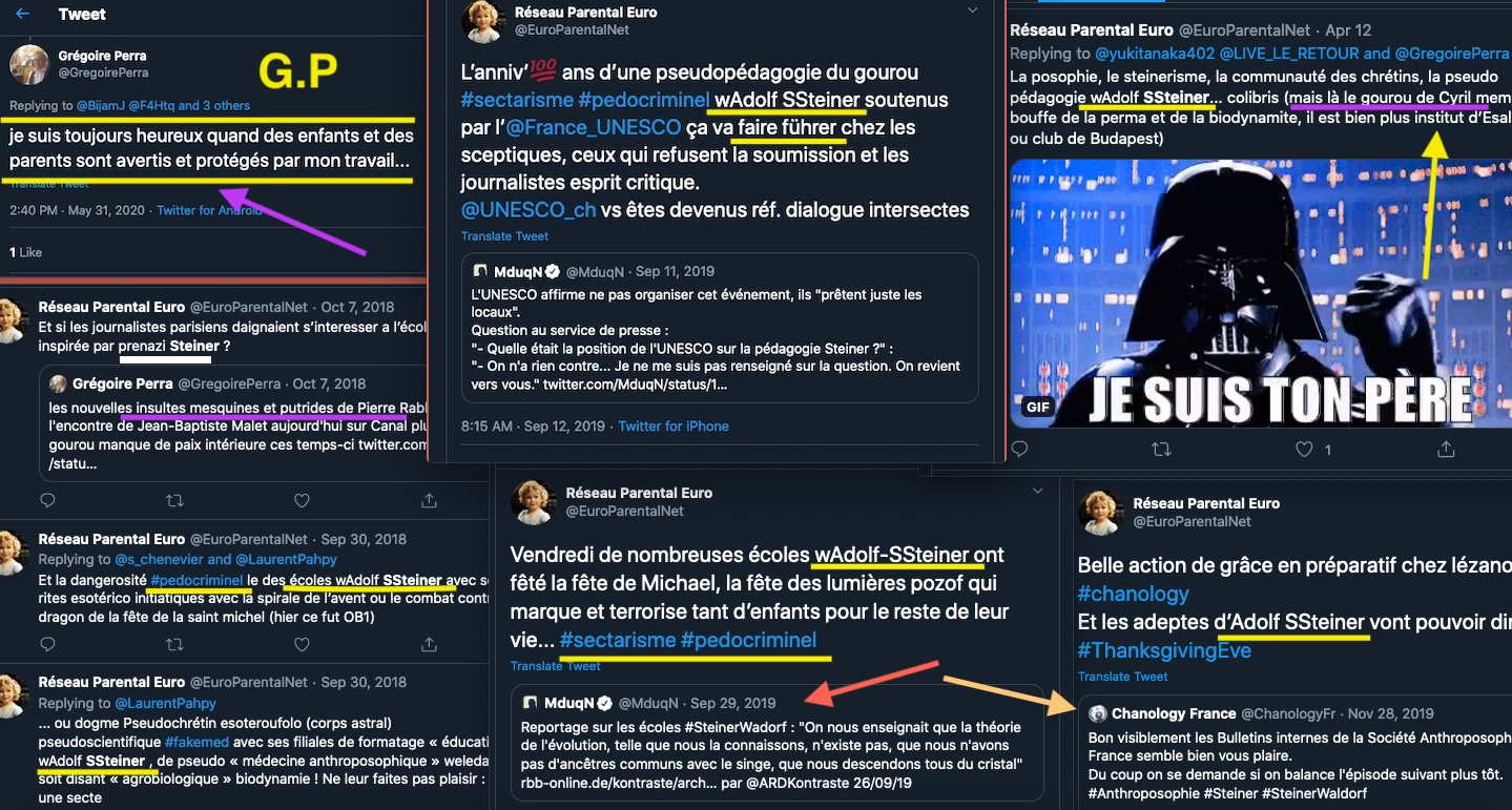 Oneo, diffame à répétition en traitant les anthroposophes de pédo-criminels : https://twitter.com/SylvainBucheron/status/1397165037651992576?s=20 (j’en ai archivé une bonne vingtaine).