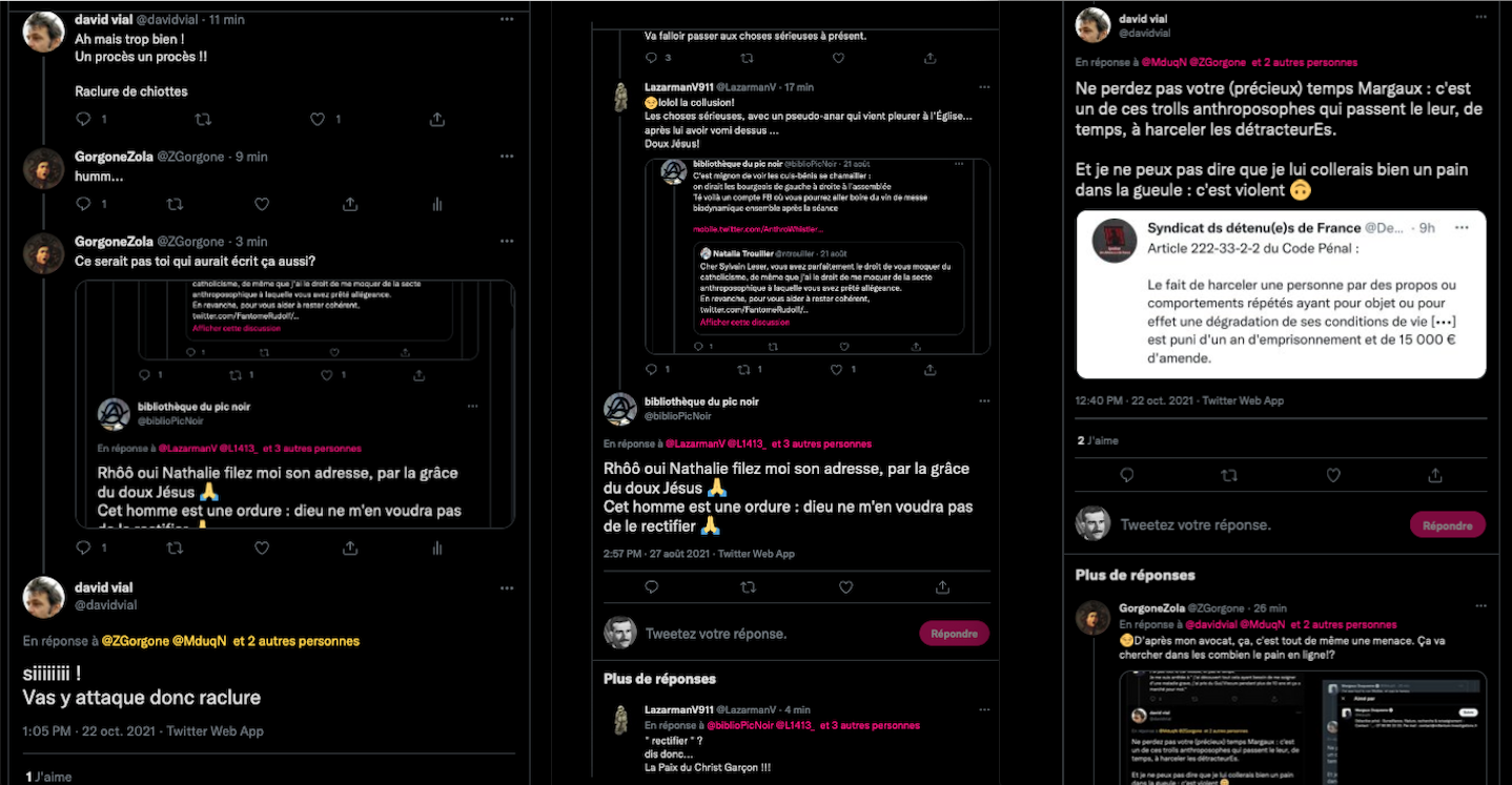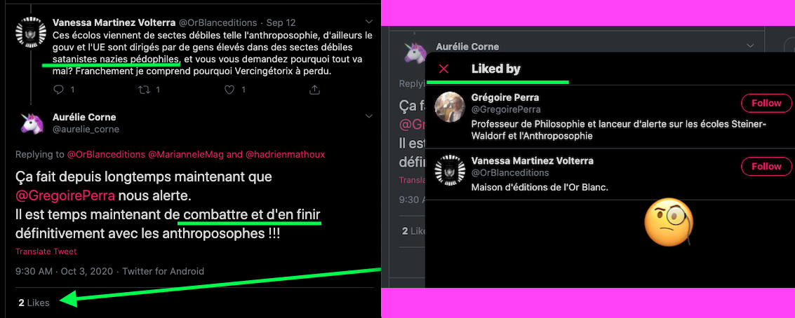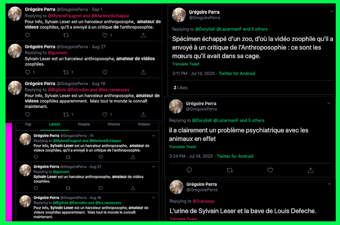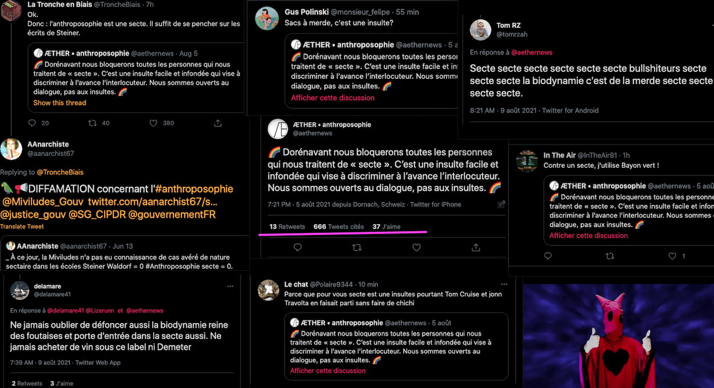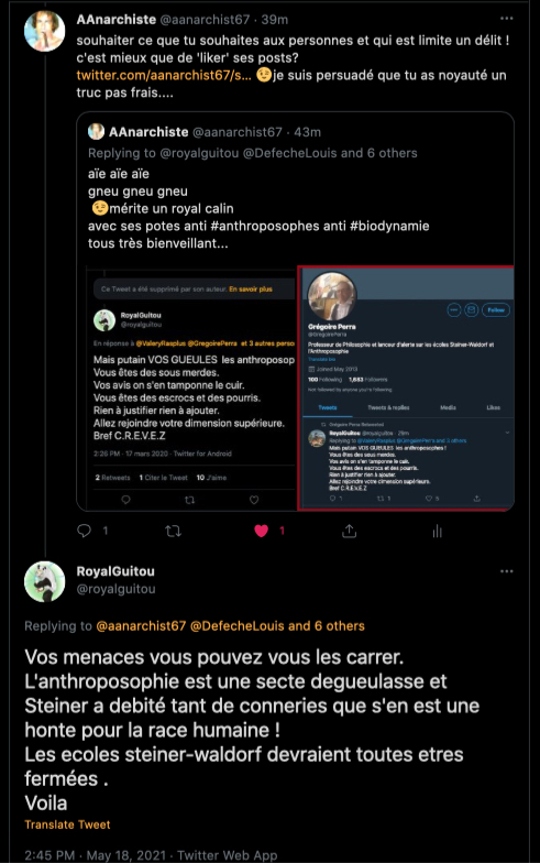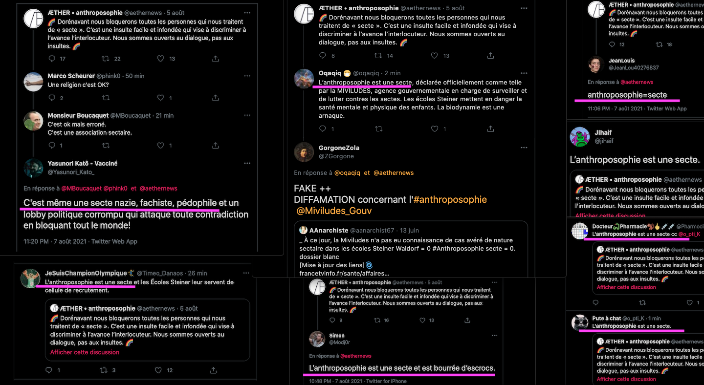 Oneo, diffame à répétition en traitant les anthroposophes de pédo-criminels : https://twitter.com/SylvainBucheron/status/1397165037651992576?s=20 (j’en ai archivé une bonne vingtaine).