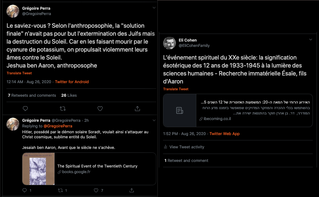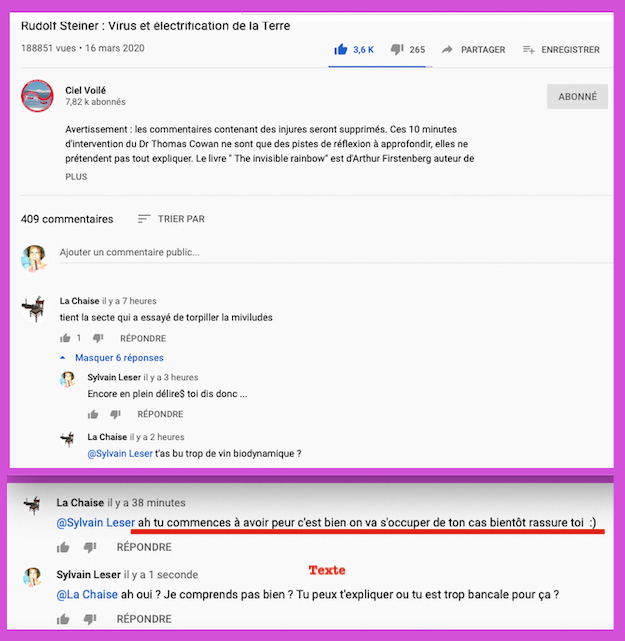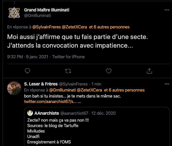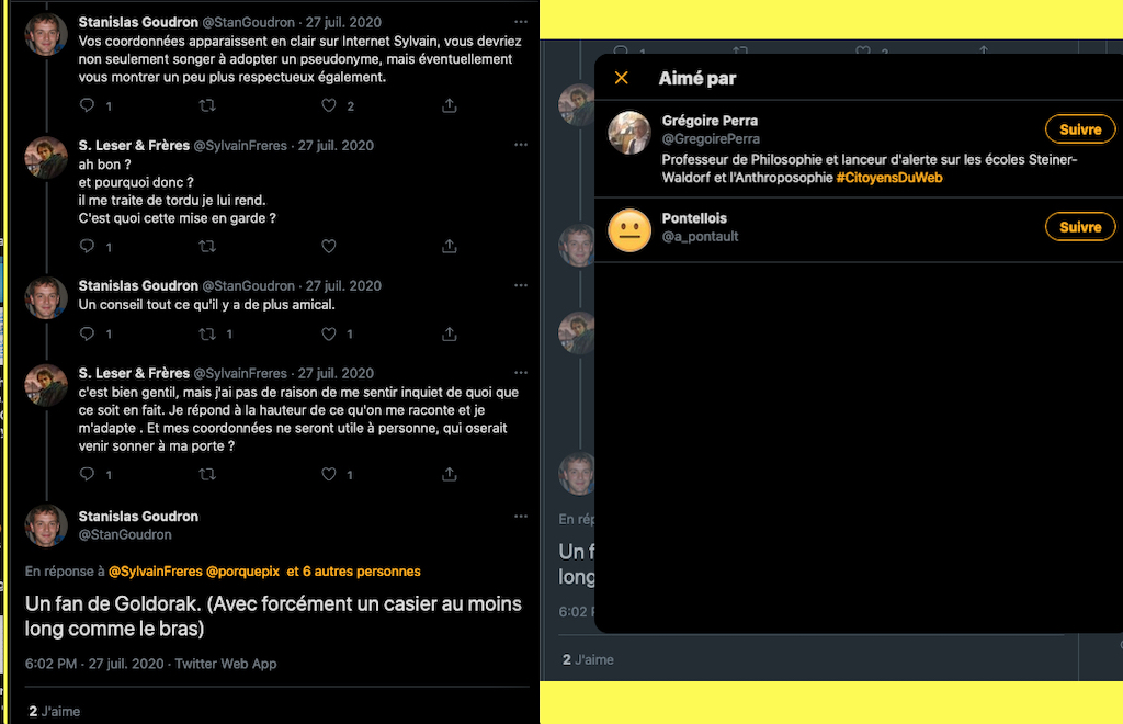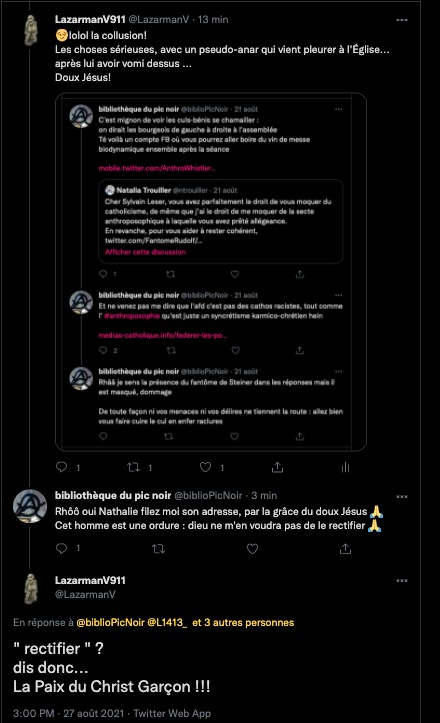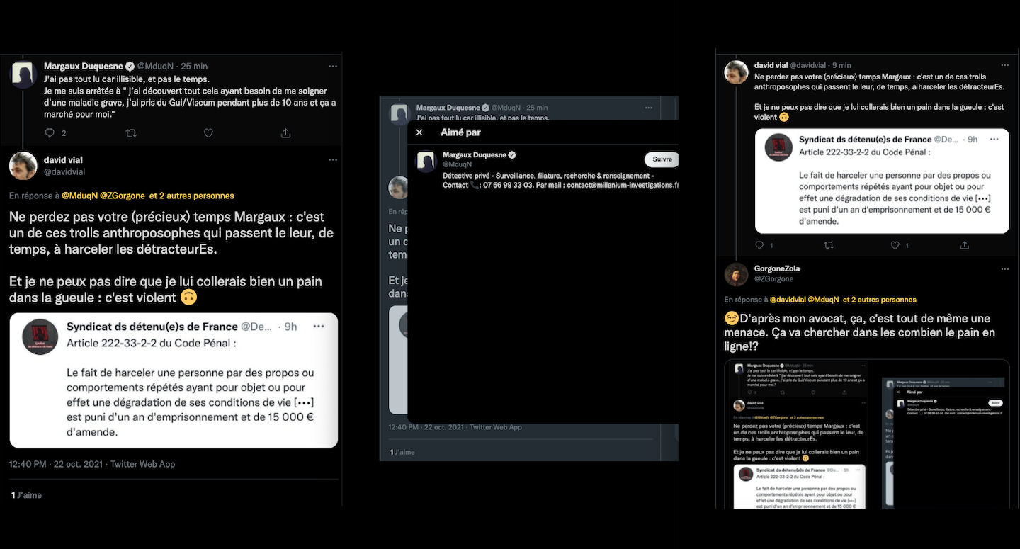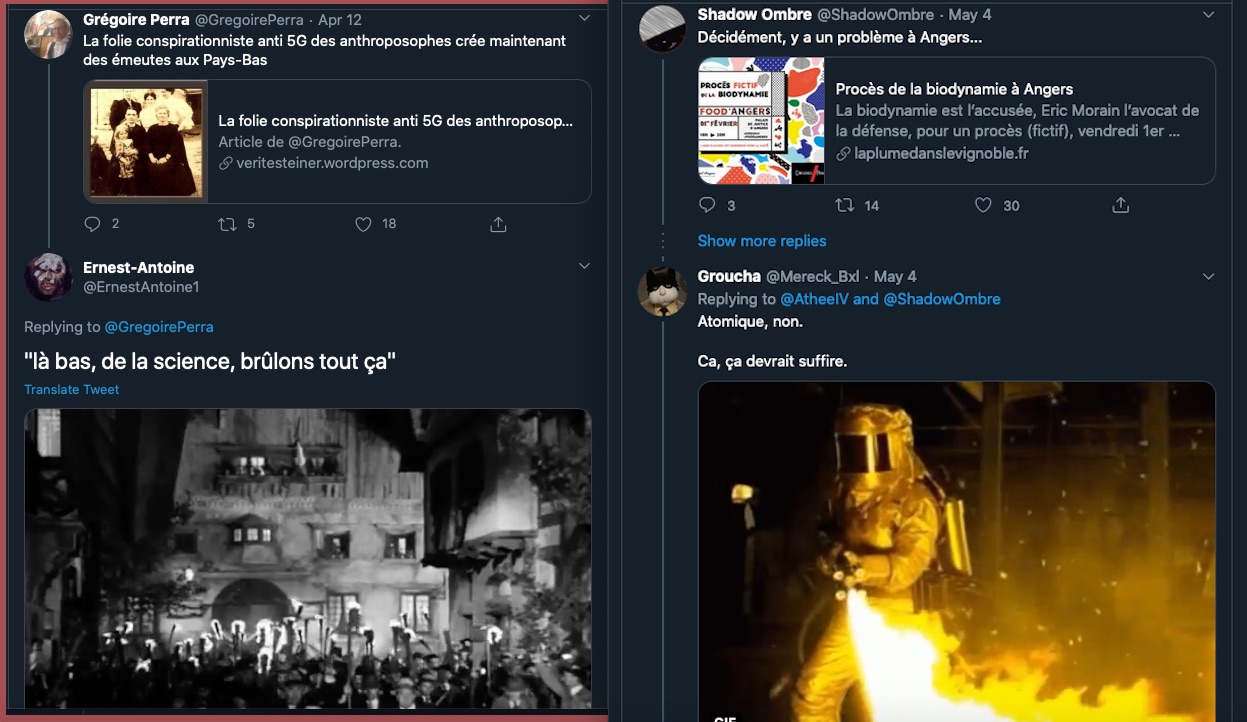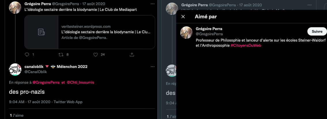 Oneo, diffame à répétition en traitant les anthroposophes de pédo-criminels : https://twitter.com/SylvainBucheron/status/1397165037651992576?s=20 (j’en ai archivé une bonne vingtaine).