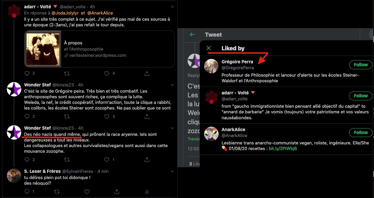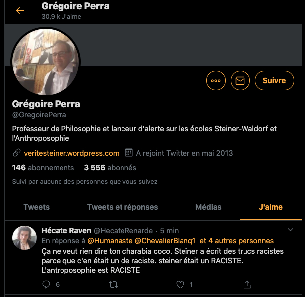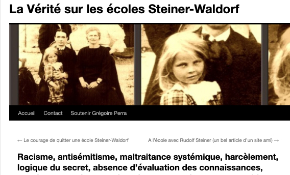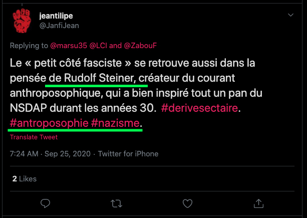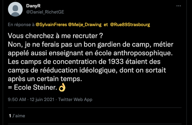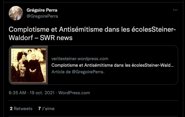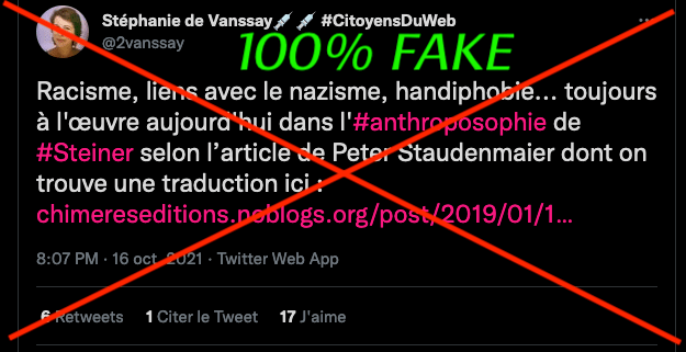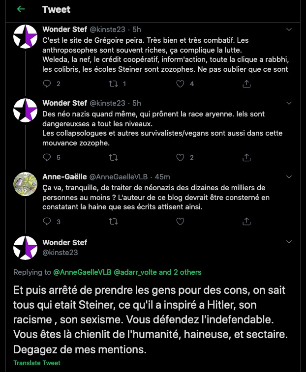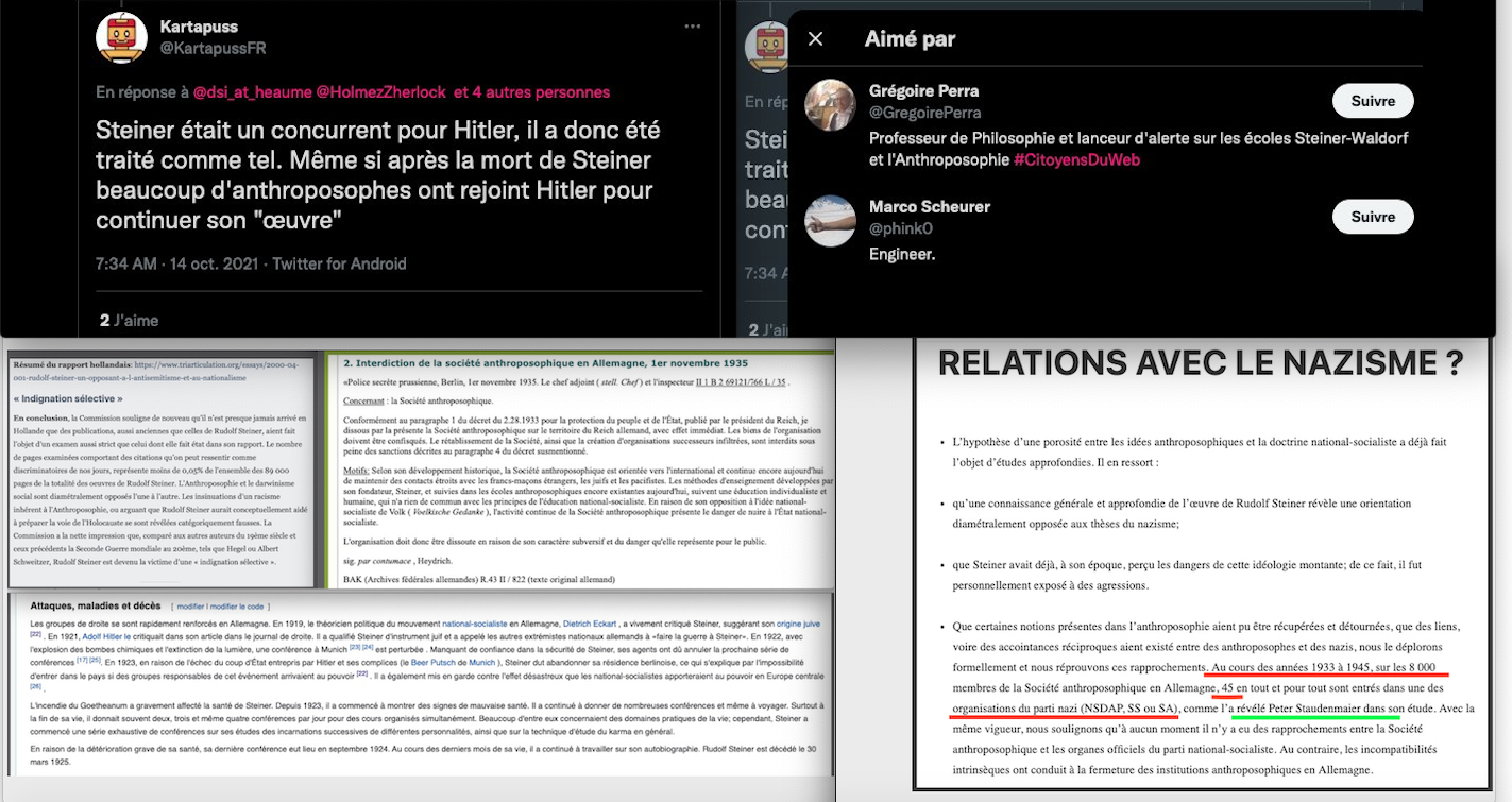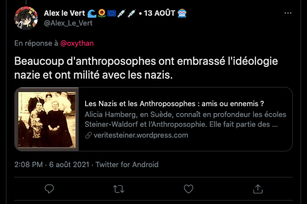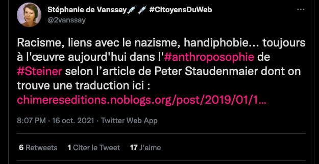 1 _ Un exemple vient d‘être publié, elle, qui se la raconte conformiste et gardienne du web. Elle est une syndicaliste de l’éducation et je me demande si son syndicat la cautionne, à eux de voir. Elle s’en est pris à un ami, le traitant de faux professeur sans diplôme et a tout fait pour faire faire retirer ses annonces, de « recherche d’emploi », professionnelles. Le tout basé sur de la calomnie, de la diffamation. Participant avec d’autres à faire passer Alexandre pour un genre de fan suprémaciste qui s’exhiberait avec une arme à feu sur les réseaux sociaux. Le tout est complètement faux d’ailleurs mais des éléments de cette fâcheuse histoire continuent de circuler sur internet : https://twitter.com/SylvainFreres/status/1431782470123495424?s=20 Elle mérite un peu plus qu’un rappel à la loi. Vous retrouverez une partie de cette histoire sur ce Tweet ici : https://twitter.com/SylvainFreres/status/1418178127398936585?s=20 . Là, elle vient de raconter en se cachant derrière l’article de Peter Staudenmaier qui stipulerait qu’aujourd’hui qu’il y aurait encore de ce genre de choses : » Racisme, liens avec le nazisme, handiphobie… toujours à l’œuvre aujourd’hui dans l’anthroposophie de Steiner « . La réalité est ailleurs, pour commencer Steiner n’était pas raciste mais le contraire : https://www.aether.news/rudolf-steiner-contre-le-racisme/ & https://twitter.com/FantomeRudolf/status/1429081673992478727?s=20 & https://info3-verlag.de/projekte/frankfurter-memorandum/ & Déclaration : anthroposophie et racisme : https://goetheanum.co/fr/nouvelles/declaration-anthroposophie-et-racisme-octobre-2021 etc. Racisme? : https://www.pedagogie-waldorf.fr/2021/02/26/kenneth-chenault-membre-du-conseil-dadministration-de-facebook-ancien-eleve/ Racisme? : https://lamehumaine.com/2020/07/13/rudolf-steiner-et-les-legumes-survivants-de-lholocauste/ …