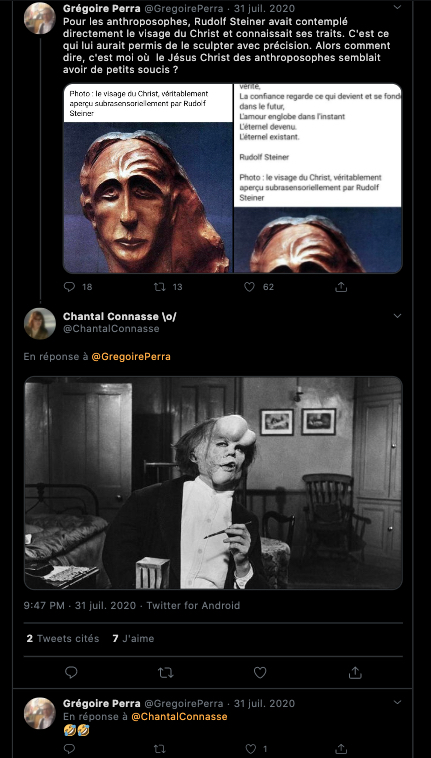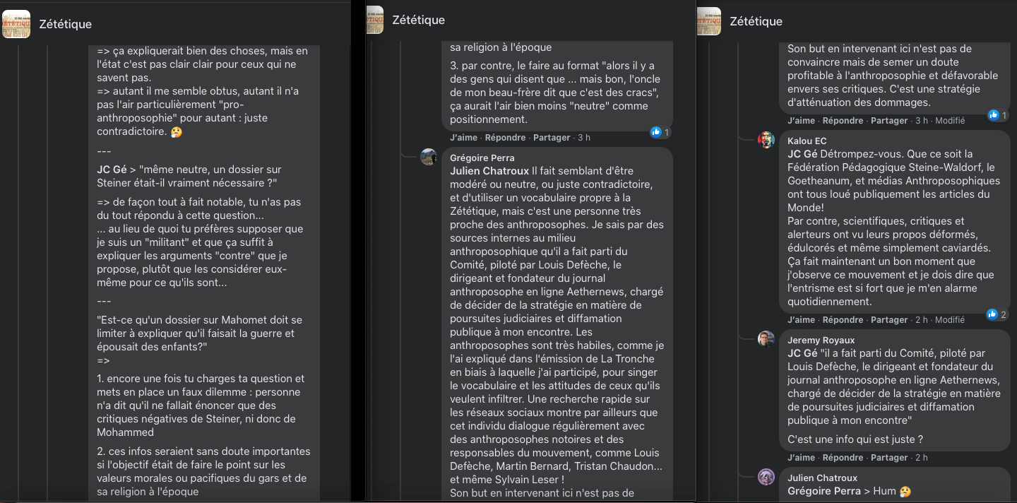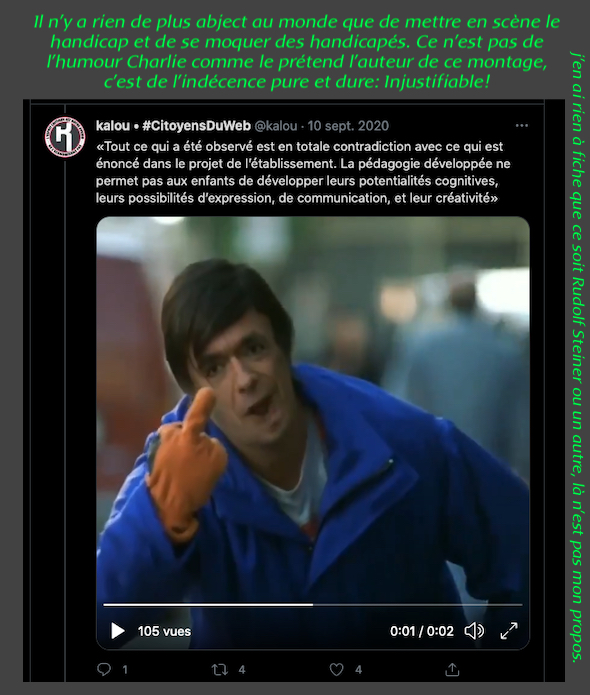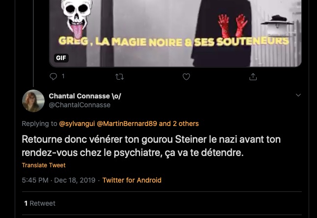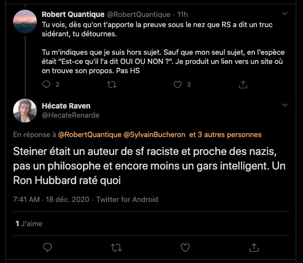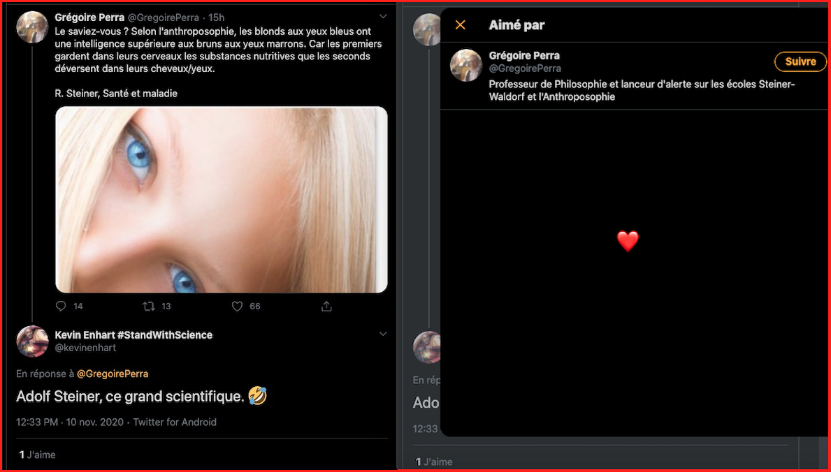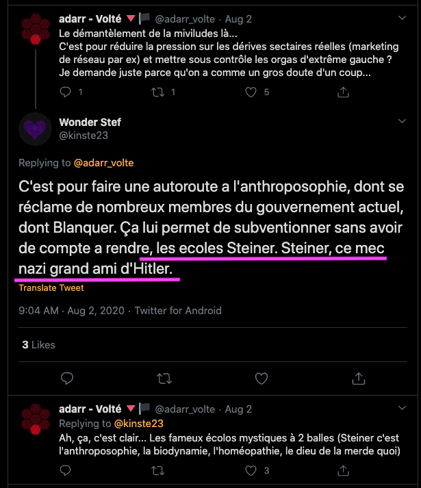 1 _ Un exemple vient d‘être publié, elle, qui se la raconte conformiste et gardienne du web. Elle est une syndicaliste de l’éducation et je me demande si son syndicat la cautionne, à eux de voir. Elle s’en est pris à un ami, le traitant de faux professeur sans diplôme et a tout fait pour faire faire retirer ses annonces, de « recherche d’emploi », professionnelles. Le tout basé sur de la calomnie, de la diffamation. Participant avec d’autres à faire passer Alexandre pour un genre de fan suprémaciste qui s’exhiberait avec une arme à feu sur les réseaux sociaux. Le tout est complètement faux d’ailleurs mais des éléments de cette fâcheuse histoire continuent de circuler sur internet : https://twitter.com/SylvainFreres/status/1431782470123495424?s=20 Elle mérite un peu plus qu’un rappel à la loi. Vous retrouverez une partie de cette histoire sur ce Tweet ici : https://twitter.com/SylvainFreres/status/1418178127398936585?s=20 . Là, elle vient de raconter en se cachant derrière l’article de Peter Staudenmaier qui stipulerait qu’aujourd’hui qu’il y aurait encore de ce genre de choses : » Racisme, liens avec le nazisme, handiphobie… toujours à l’œuvre aujourd’hui dans l’anthroposophie de Steiner « . La réalité est ailleurs, pour commencer Steiner n’était pas raciste mais le contraire : https://www.aether.news/rudolf-steiner-contre-le-racisme/ & https://twitter.com/FantomeRudolf/status/1429081673992478727?s=20 & https://info3-verlag.de/projekte/frankfurter-memorandum/ & Déclaration : anthroposophie et racisme : https://goetheanum.co/fr/nouvelles/declaration-anthroposophie-et-racisme-octobre-2021 etc. Racisme? : https://www.pedagogie-waldorf.fr/2021/02/26/kenneth-chenault-membre-du-conseil-dadministration-de-facebook-ancien-eleve/ Racisme? : https://lamehumaine.com/2020/07/13/rudolf-steiner-et-les-legumes-survivants-de-lholocauste/ …