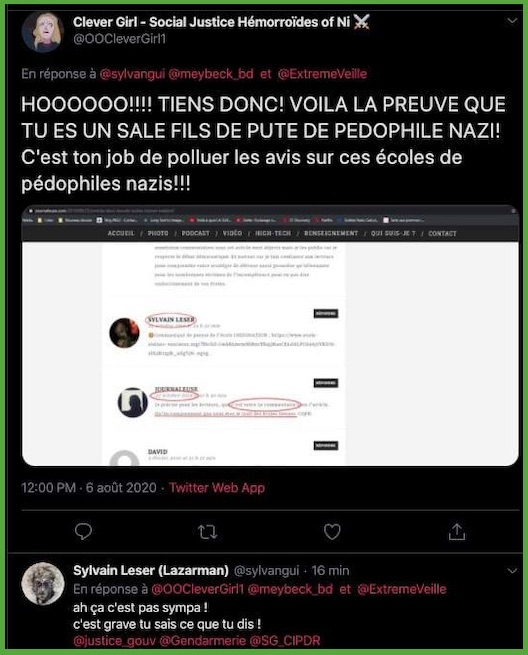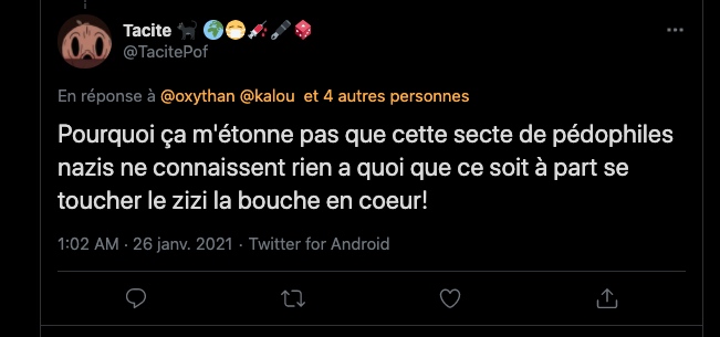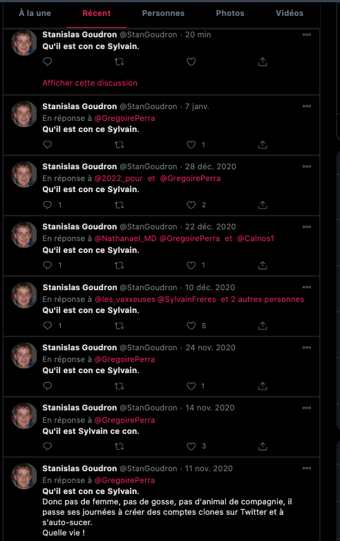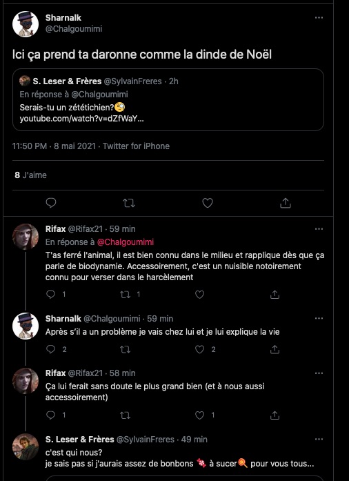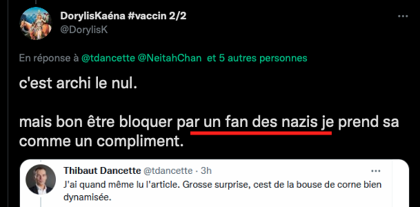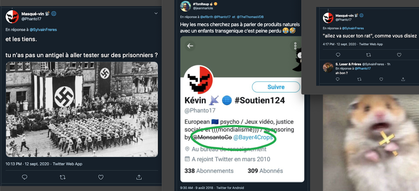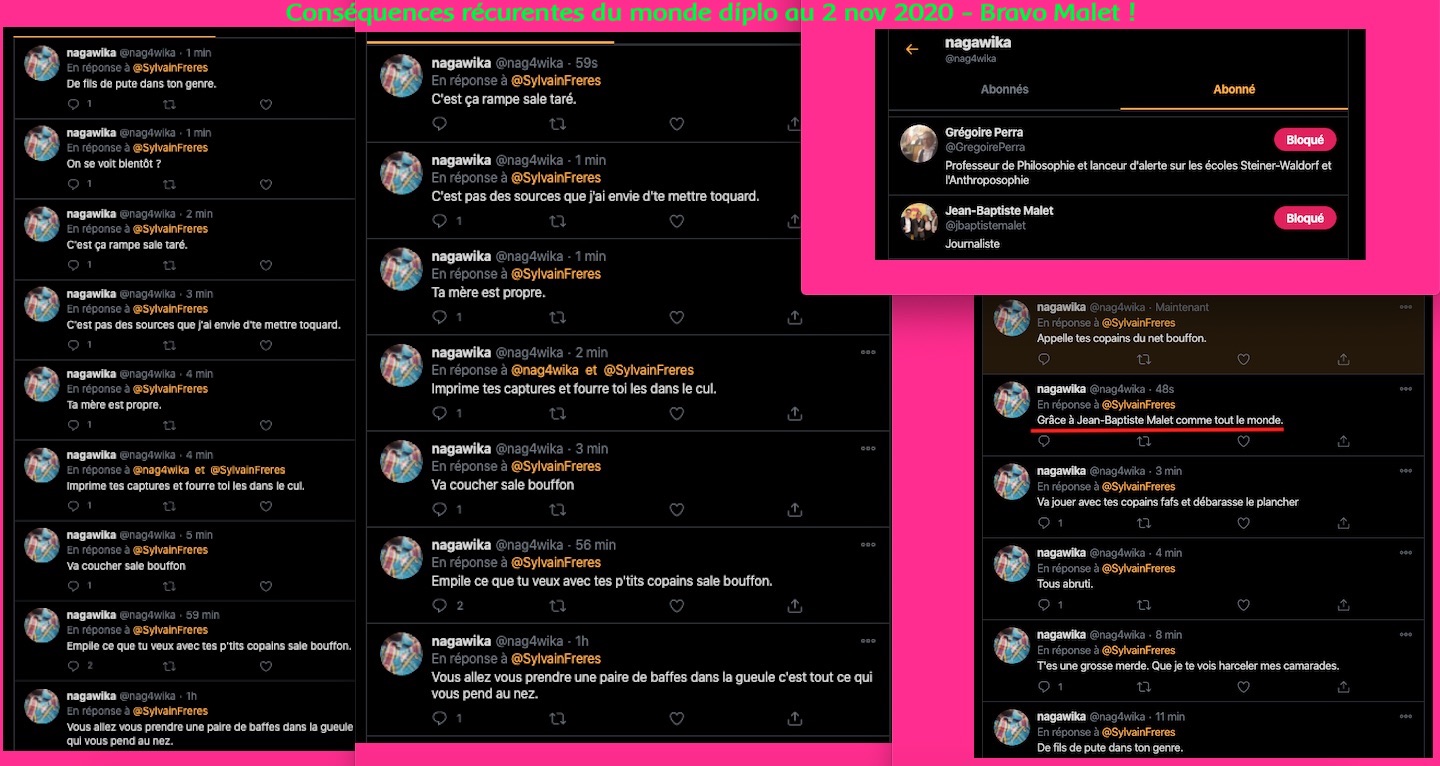 Cela fait des mois que j’observe leurs attitudes sauce Facho/Collabo/Vichy. des listes. de la dénonciation. ils inversent et accusent de ce qu’ils sont et certains font du révisionnisme. alors en plus du bashing et du mobbing: ils sont répugnants & rongés : https://twitter.com/ArchibaldMcEnd/status/1299672571273674752/photo/1 & https://twitter.com/ArchibaldMcEnd/status/1302000561991098368?s=20 & https://twitter.com/ArchibaldMcEnd/status/1302000561991098368?s=20 & https://twitter.com/ArchibaldMcEnd/status/1302000561991098368/photo/1 & https://twitter.com/ArchibaldMcEnd/status/1302000561991098368/photo/2 & https://twitter.com/ArchibaldMcEnd/status/1302000561991098368/photo/3 & dur dur les gars : https://twitter.com/ArchibaldMcEnd/status/1302000561991098368/photo/4 … Lire ici : https://lamehumaine.com/2021/04/21/bionazi-la-suite/ – https://twitter.com/ArchibaldMcEnd/status/1302000561991098368?s=20 -Chanolopopo insulte comme c’est pas permis : https://twitter.com/SylvainBucheron/status/1397545803284197377?s=20 & il fait dans la biodynamie aussi : https://twitter.com/SylvainBucheron/status/1398660138840506375?s=20 – J’en ai des tonnes sur lui. Le harcèlement envers Alexandre mérite un rappel à la loi : https://twitter.com/SylvainFreres/status/1419679613849067522?s=20 & https://twitter.com/SylvainFreres/status/1419679613849067522/photo/2