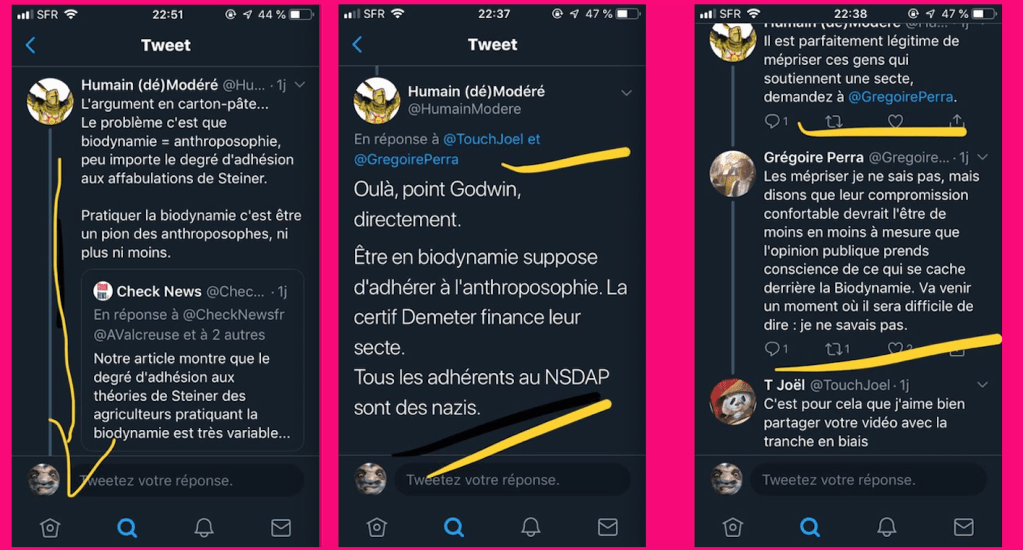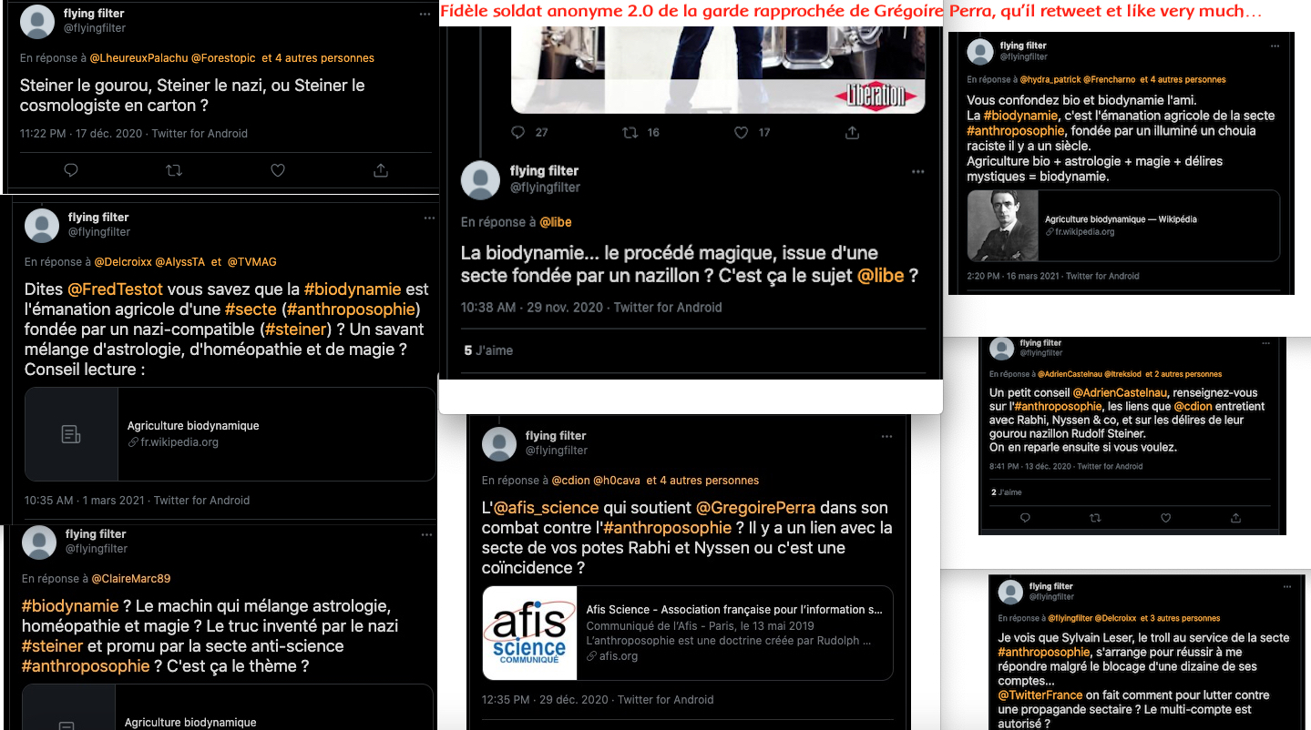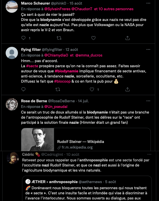 Ça fait depuis 2019 que j’observe leur manège et je ne suis pas le seul, tout le monde le sait pour (l’astroturfing anti-biodynamie à la française, archives : https://twitter.com/SylvainFreres/status/1294836071503745024?s=20, Y a du récent, avec les petits nouveaux.)…
