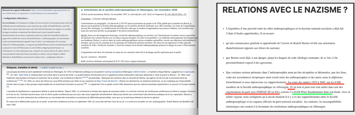 Les faits historiques : On peut compter en Allemagne de 1933 environ 8000 personnes membres des sociétés anthroposophiques. Jusqu’en 2011, on en connaissait 45 qui étaient entrées dans le parti, la SS ou la SA. Pour donner une idée concrète de la situation de l’époque à ce niveau, il faut rappeler qu’en Allemagne, en 1939, pas moins d’une personne sur 13 était membre du parti nazi soit 5,3 millions de personnes sur une population totale de 69,9 millions. https://www.aether.news/transparence-anthroposophie/