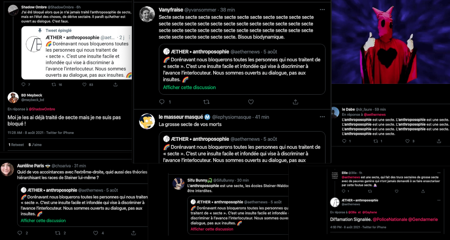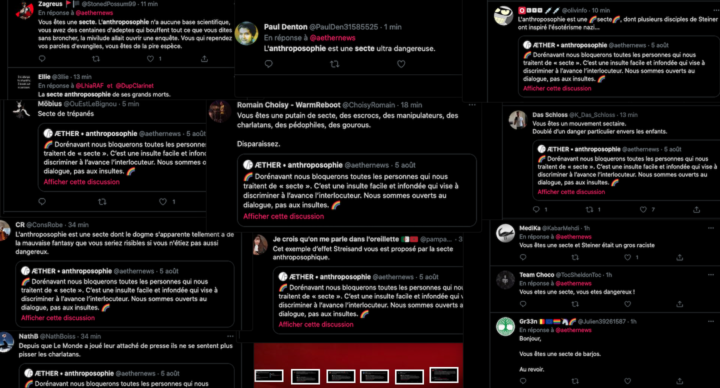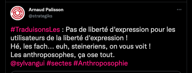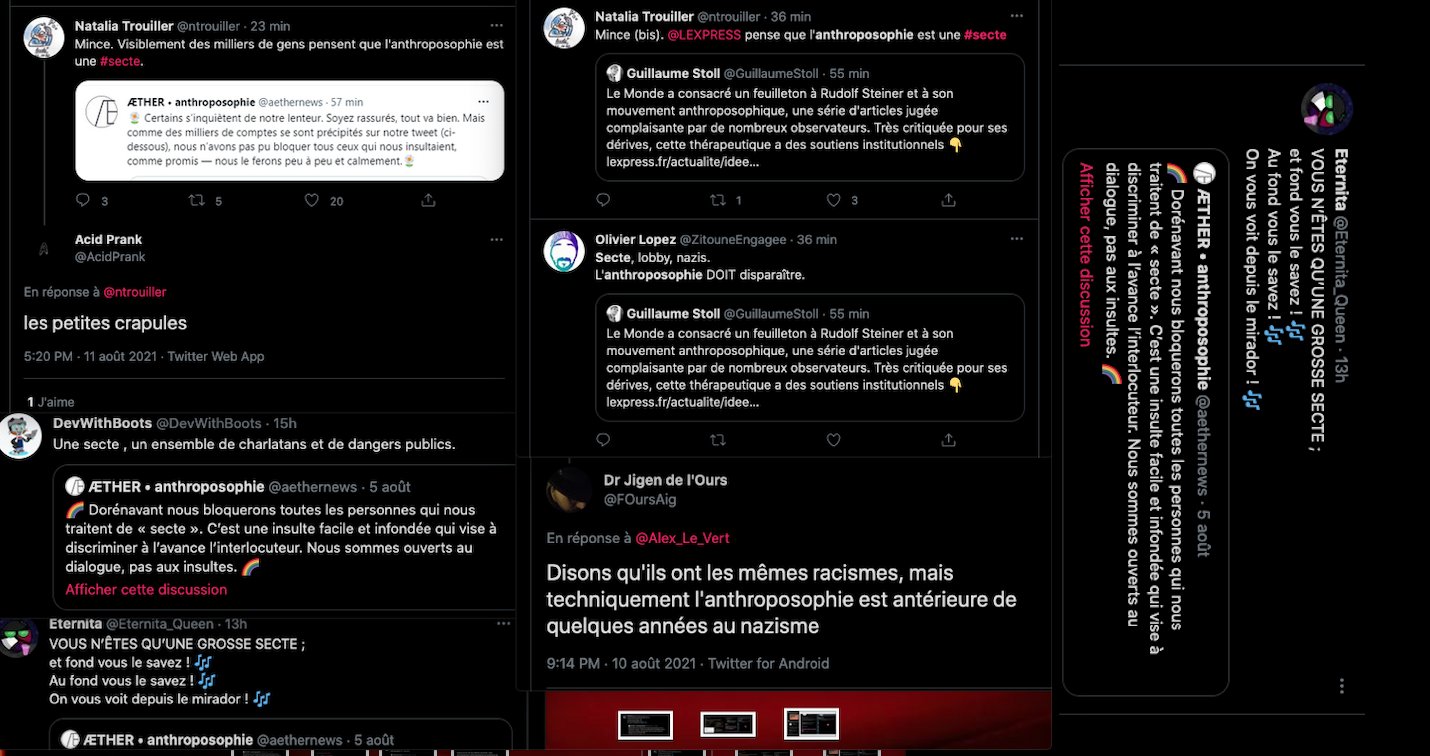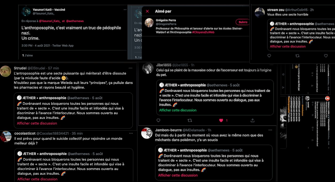 On se rappelle aussi la fermeture des comptes Twitter de l’anthroposophie, à grands coups de signalements abusifs : https://twitter.com/FantomeRudolf/status/1300232630550622208?s=20