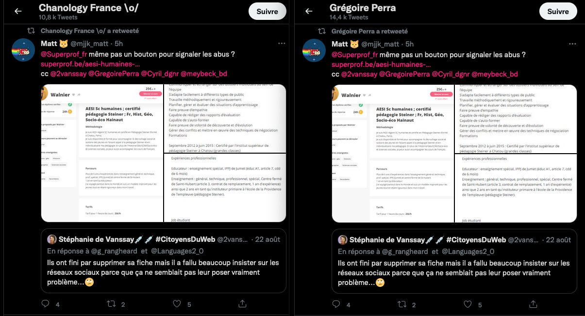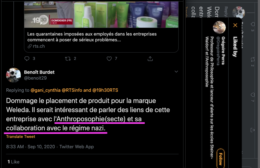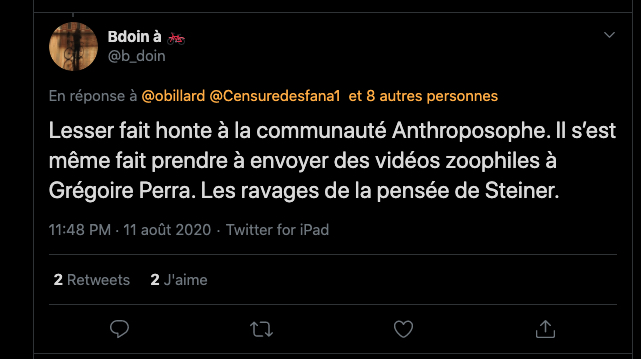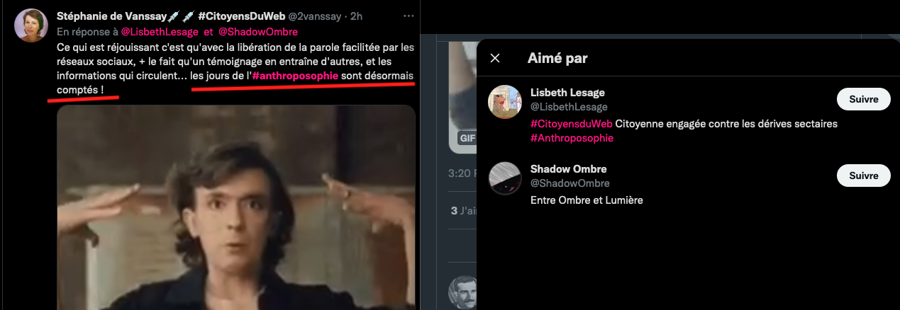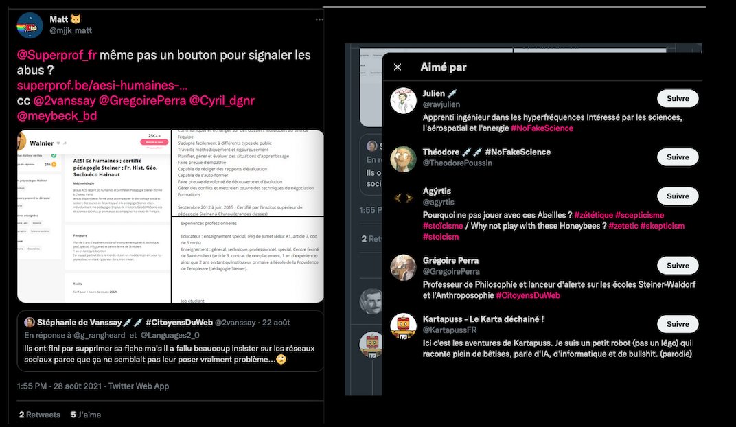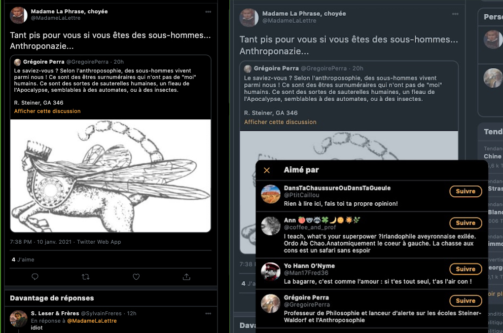 On se rappelle aussi la fermeture des comptes Twitter de l’anthroposophie, à grands coups de signalements abusifs : https://twitter.com/FantomeRudolf/status/1300232630550622208?s=20