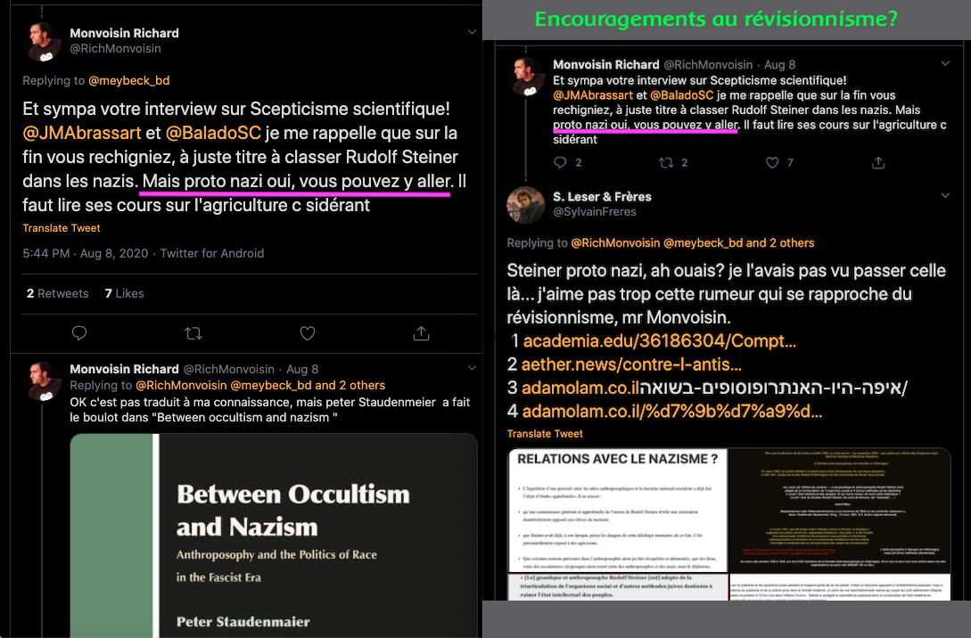 Je remarque cela concernant l’anthroposophie et les anthroposophes dont 45 d’entre eux ont rejoint le nazisme sur 8000. Il est anormal, en 2021, en France de voir les communautés de haters pseudos-rationalistes fans de zététique (secte, qui racole pour les grosses boites de l’agro-pétrochimie) et leurs comparses inonder et encourager sur les réseaux sociaux un tel pénible enfumage.