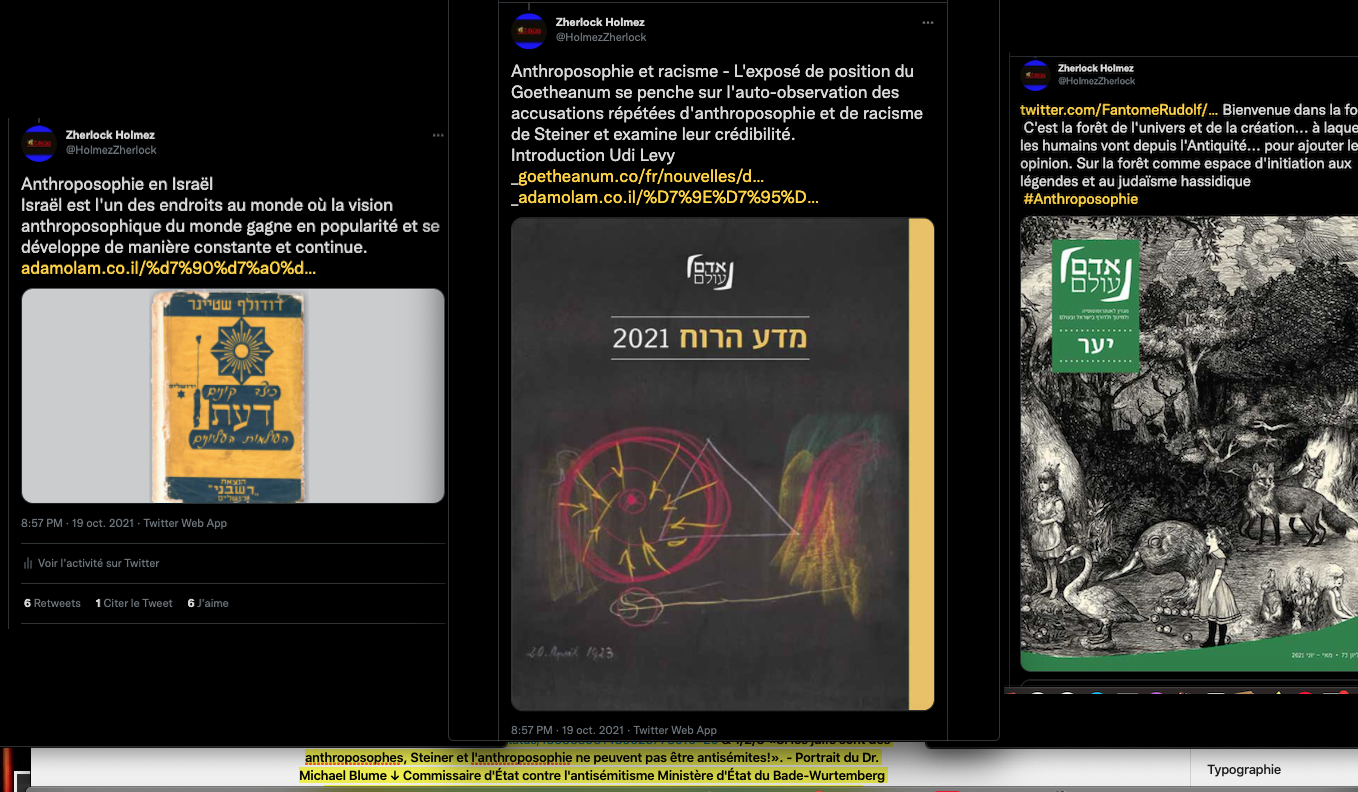 Certains sont difficiles, certains sont surprenants, tous sont inspirants : https://adamolam.co.il/מה-חינוך-ולדורף-צריך-כדי-להיות-מכוון-לר/ – & https://adamolam.co.il/ארבעה-נכנסו-לפרדס-היער-כמרחב-חניכה/ & https://twitter.com/HolmezZherlock/status/1450540103437373447?s=20 & https://twitter.com/HolmezZherlock/status/1450536575247474688?s=20 & Anthroposophie et racisme – L’exposé de position du Goetheanum se penche sur l’auto-observation des accusations répétées d’anthroposophie et de racisme de Steiner et examine leur crédibilité. Introduction et traduction de l’allemand : _ https://goetheanum.co/fr/nouvelles/declaration-anthroposophie-et-racisme-octobre-2021… _ https://adamolam.co.il/מוצר/אדם-עולם-מדע-הרוח-5-2021/#
