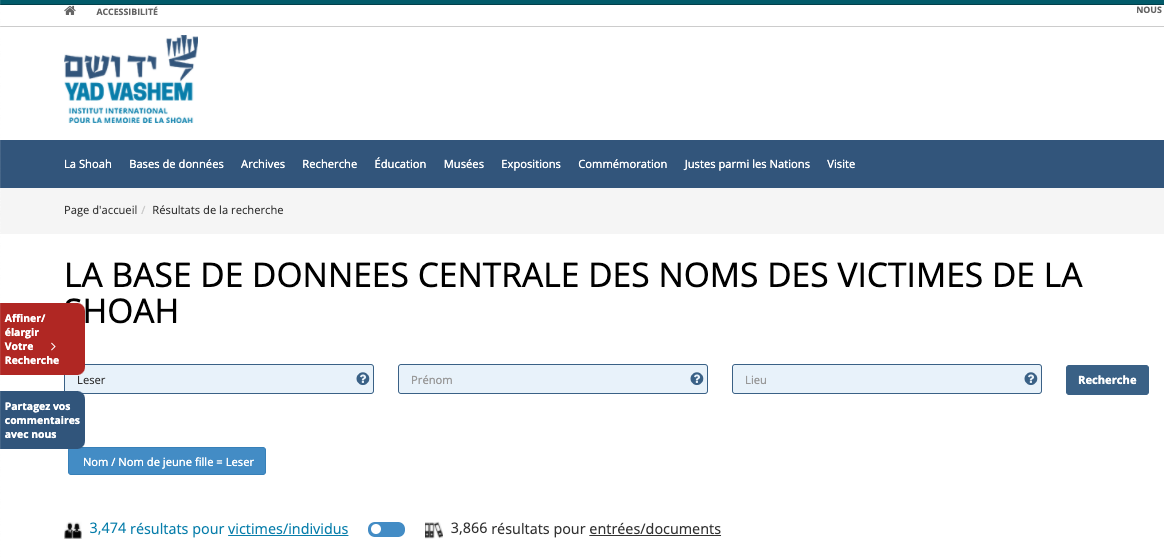 J’ai une sainte horreur des révisionnistes, alors je regarde là pour voir qui me parle: Tapez votre nom, puis le mien dans cette base ⤦ Perso j’y ai cherché des correspondances avec ma famille car je pense que s’appeler Leser ne devait pas être simple à cette époque: https://yvng.yadvashem.org/index.html?language=fr