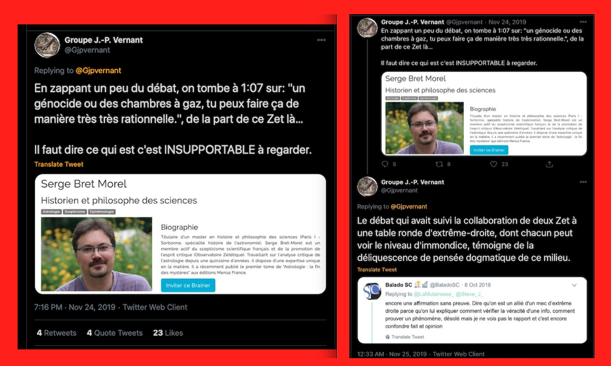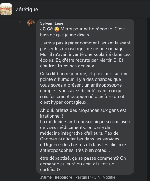 ‘On’ causait de moi, normal que j’ai débarqué sur ce fil. 🙂 Chez les zet, qui ont pour certains la gentillesse de ma laisser m’exprimer en public, entre les sous-fils y a de la matière à lire. https://www.facebook.com/groups/zetetique/permalink/10159281042628186/