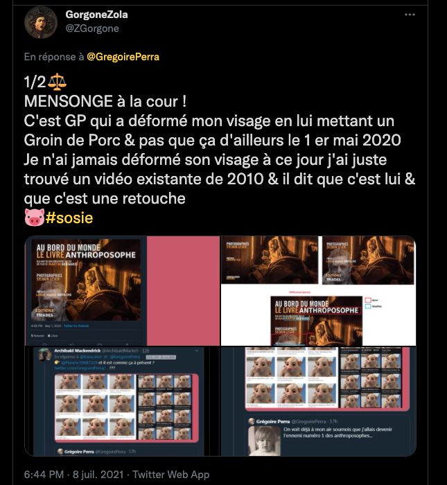 En rappelant que GP a fait mentir son baveux à la barre et que c’est lui qui a déformé mon image, ayant aussi calomnié, diffamé publiquement des œuvres aux quelles je participe tentant de me nuire professionnellement, …comme un vilain petit cochon… Plus d’infos sur ce dossier si besoin et à la demande…