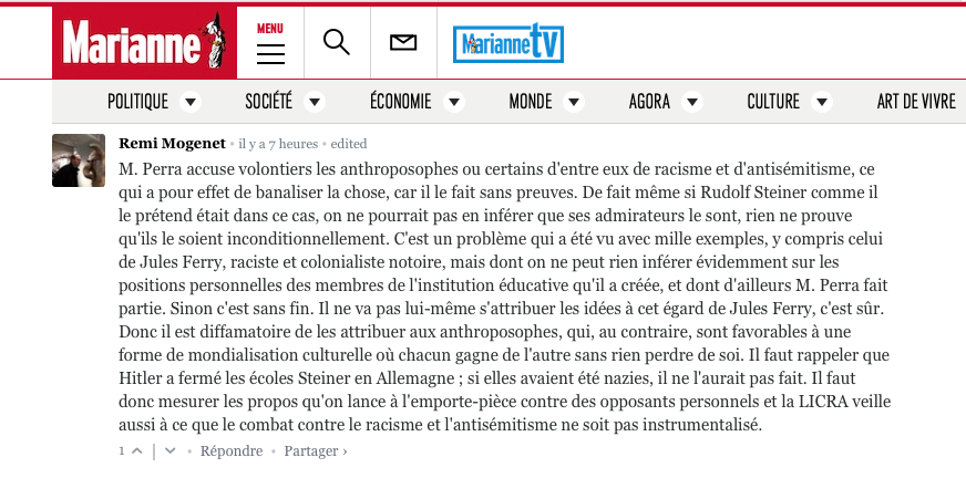 L’anthroposophie, les anthroposophes et les allégations de racisme antisémitisme. Ça ne passe pas du tout finalement. Chez Marianne non plus qui semble manquer le vrai sujet, journalisme en faillite. Un comm’ de @Remimogenet http://disq.us/p/2mmbuem , https://twitter.com/SylvainFreres/status/1489527986063822849?s=20&t=6eWHVI6irFNcDhNHqLsAzQ & Marianne à manqué le sujet de ce non événement en préférant d’ailleurs parler du slip de leur pote, plus que de ses menaces. Et, en passant complètement à coté du vrai sujet, antisémitisme, racisme, et allégations foireuses https://twitter.com/FantomeRudolf/status/1489529680642387970?s=20&t=6eWHVI6irFNcDhNHqLsAzQ& https://twitter.com/ZGorgone/status/1489548883659472897?s=20&t=2mDdxYU2kn51O83tOoVF8Q