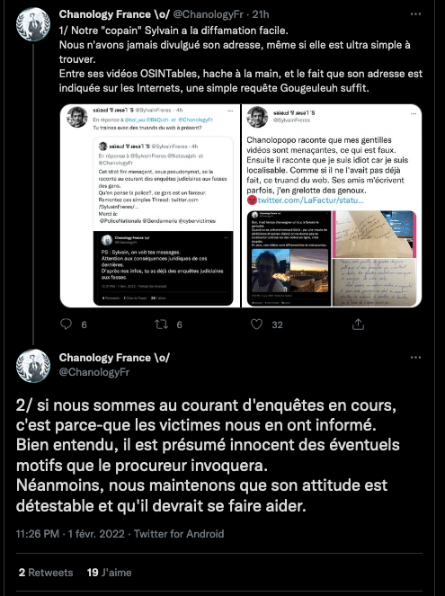 – Cet idiot fini menaçant, sous pseudonymat, se la raconte au courant des enquêtes judiciaires aux fesses des gens. Qu’en pense la police?, ce gars est un farceur. Remontez ces simples Thread: https://twitter.com/SylvainFreres/status/1477782158248972289?s=20&t=thzsbysEETvdIgUDOAAdAw & https://twitter.com/SylvainFreres/status/1488567579320926209?s=20&t=thzsbysEETvdIgUDOAAdAw & https://twitter.com/SylvainFreres/status/1488567579320926209/retweets/with_comments & Tu traines avec des truands du web à présent? https://twitter.com/SylvainFreres/status/1488567968237854729?s=20&t=thzsbysEETvdIgUDOAAdAw