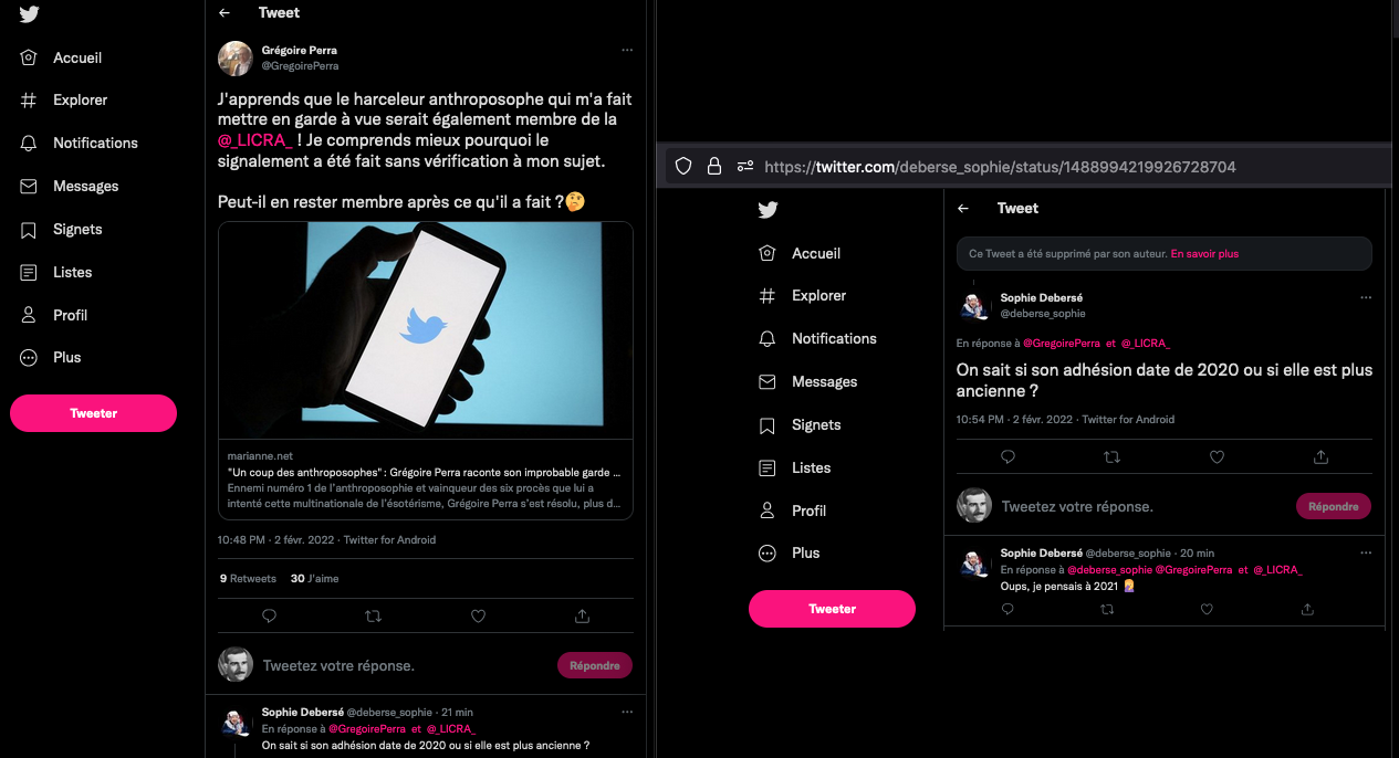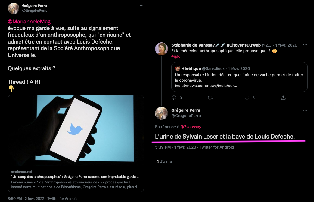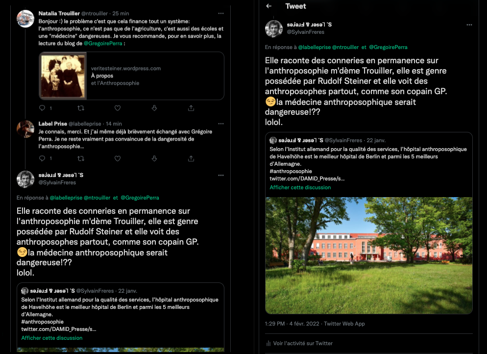 https://twitter.com/SylvainFreres/status/1488452175793729539?s=20&t=4x9sXboqbPljOmw2Imd-GQ & https://twitter.com/SylvainFreres/status/1488459519722205189?s=20&t=4x9sXboqbPljOmw2Imd-GQ & https://twitter.com/SylvainFreres/status/1488460546898866177?s=20&t=4x9sXboqbPljOmw2Imd-GQ & https://twitter.com/SylvainFreres/status/1488464974787883008?s=20&t=L4BqtWTSziC8B8dn1c9aoA & https://twitter.com/SylvainFreres/status/1488465929742790663?s=20&t=4x9sXboqbPljOmw2Imd-GQ & Et , lorsque cela ne leur plait pas : Hop, menaces de représailles avec des p’tits rigolos, a bien dérouler : https://twitter.com/SylvainFreres/status/1488466621433790466?s=20&t=L4BqtWTSziC8B8dn1c9aoA & Ah d’accord, le mec serait une oie blanche? Pourtant il dit bien que l’anthroposophie, les anthroposophes sont des racistes antisémites ou je ne sais pas lire? https://twitter.com/SylvainFreres/status/1488467274101149696?s=20&t=L4BqtWTSziC8B8dn1c9aoA – L’injure publique, tu connais? https://twitter.com/SylvainFreres/status/1488478199919087622?s=20&t=Jww16Ywb5KwuWhdO-B0z_Q