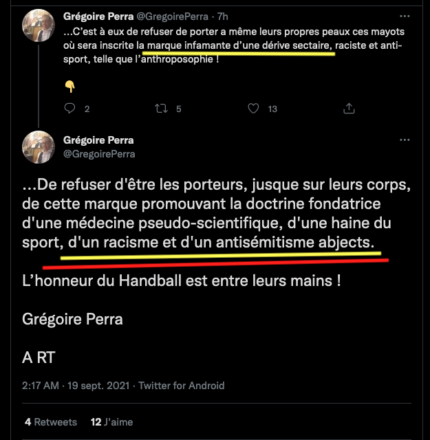Sinon avec Rémi on en discute aussi ici : Grégoire Perra prétend que les anthroposophes sont forcément racistes comme il dit que l’est Rudolf Steiner parce qu’ils ne peuvent pas remettre en cause ses idées et il sait très bien que c’est faux, c’est diffamatoire. https://twitter.com/SylvainFreres/status/1488938929516646408?s=20&t=QUVjTSoviluRvSdMtacmYA