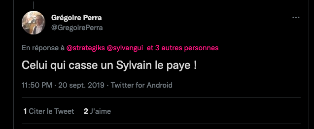 Une sans doute franc-maçonne qui veut encourager financièrement Perra à porter plainte contre moi pour ses propos racistes, je vais me mordre les lèvres pour arrêter de rire et faire un saut périlleux arrière en applaudissant des pieds et des mains pour me calmer, j’ai hâte. Honck, Honck, Honck, Honck, Honck, Honck, Honck, Honck, Honck, Honck, Honck, Honck, Honck, Honck, Honck, https://twitter.com/SylvainFreres/status/1489967565602529284?s=20&t=Ca0s5QwsoyPkyKH9hwrYaA & https://twitter.com/SylvainFreres/status/1489898546123972618?s=20&t=Ca0s5QwsoyPkyKH9hwrYaA & La garde rapprochée de GP, le petit Stan Goudron avec qui des menaces de représailles avérées à l’encontre de ma compagne ont été faites, c’est pas joli joli non plus. V’la qu’ils me traitent de rat. 🐀 #PlainteÀlaSPA en cours … https://twitter.com/SylvainFreres/status/1487017055920570368?s=20&t=Ca0s5QwsoyPkyKH9hwrYaA