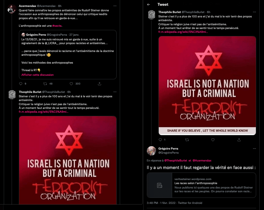 https://twitter.com/SylvainFreres/status/1465274968397201408?s=20&t=BwMMvh2v6F-AN3Vuv_QBUw… L’anthroposophie se développe plus en Israël qu’en France. Tu en penses quoi @Remimogenet https://twitter.com/SylvainFreres/status/1489221027951521794?s=20&t=ahJjMHR1QBP2RE_t3zn8dg & Car mine de rien c’est pas kascher ce genre de propos à l’encontre de l’anthroposophie et des anthroposophes, si? https://twitter.com/SylvainFreres/status/1489221602449498115?s=20&t=ahJjMHR1QBP2RE_t3zn8dg & Et ça c’est bien dégueulasse à l’encontre de la communauté noire. De la part de votre copain anti anthroposophes, anthroposophie. Vous cautionnez ??? https://twitter.com/SylvainFreres/status/1489222562236309512?s=20&t=ahJjMHR1QBP2RE_t3zn8dg & 1/2 Sans oublier les manières ultra-violentes de ces personnes à l’encontre des soi-disant anthroposophes. Qui le cautionne au juste? https://twitter.com/LaFactur/status/1389145997566259201?s=20&t=zDYKUYBScnwX7Zt5yXZ2xQ https://twitter.com/SylvainFreres/status/1489223535008620547?s=20&t=ahJjMHR1QBP2RE_t3zn8dg & L’anthroposophie prend cher ces jours-ci : https://twitter.com/SylvainFreres/status/1489223771785420806?s=20&t=ahJjMHR1QBP2RE_t3zn8dg Tweet à suivre, concernant la bashing musclé anti anthroposophes, anthroposophie. Vont-ils répondre??? Eux qui aiment bien les procès publiques sur Twitter… Ou sont ils trop lâches !?? https://twitter.com/SylvainFreres/status/1489225458801643523?s=20&t=ahJjMHR1QBP2RE_t3zn8dg – https://twitter.com/SylvainFreres/status/1489015313823899649?s=20&t=g3K_uKZwyxe-aH_1APzf_Q Inutile de vous dire que mes propos n’ont pas tous été cité, quel dommage !!! https://twitter.com/SylvainFreres/status/1489193190557110277?s=20&t=g3K_uKZwyxe-aH_1APzf_Q & https://twitter.com/SylvainFreres/status/1489195613996654592?s=20&t=g3K_uKZwyxe-aH_1APzf_Q & https://twitter.com/SylvainFreres/status/1489012285918044163?s=20&t=g3K_uKZwyxe-aH_1APzf_Q