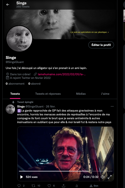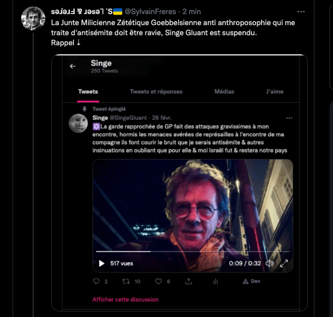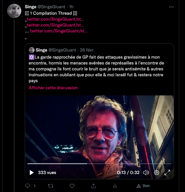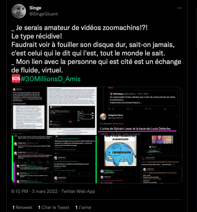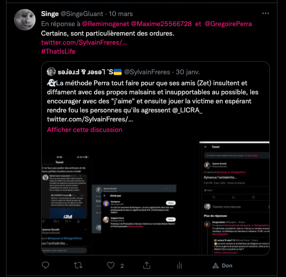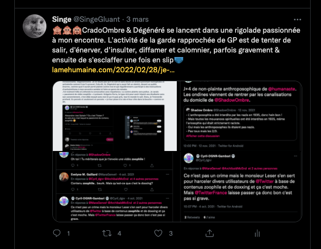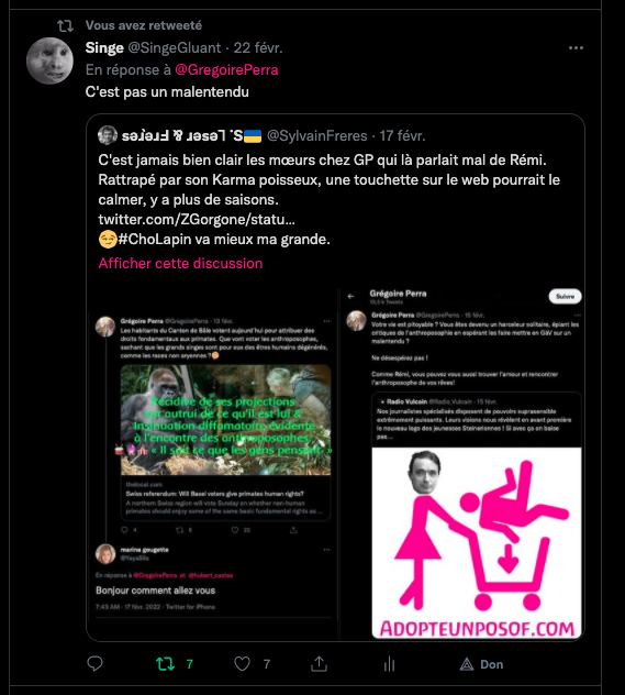 J’ai vraiment hâte et j’attends la convocation avec impatience. La contre-plainte sera poilue. Je serais « passionné de vidéo zoophile » à présent. Grégoire Perra, le type viré pour avoir tripoté une étudiante sans son consentement, s’est déjà essayé avec moi et ça n’a pas pris, tout le monde le sait. Donc, je l’emmerde profond. En pensée et seulement en pensée: « je leur pisse à la raie et leur chie dans la bouche » comme on dit. : https://twitter.com/SingeGluant/status/1499442902598045702?s=20&t=hIsalN19cxCl8-4ChAKtRw & https://twitter.com/SylvainFreres/status/1499443616867135489?s=20&t=SwEjZgpCRFbB3NTj2LFMeQ & https://twitter.com/SingeGluant/status/1499442902598045702/retweets/with_comments