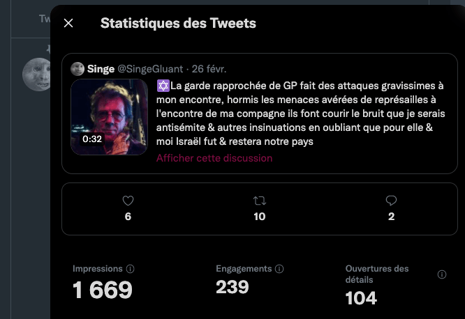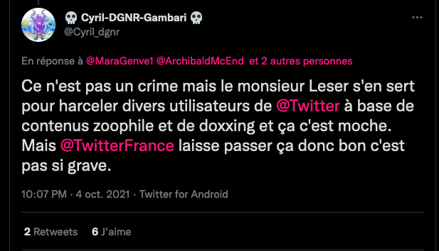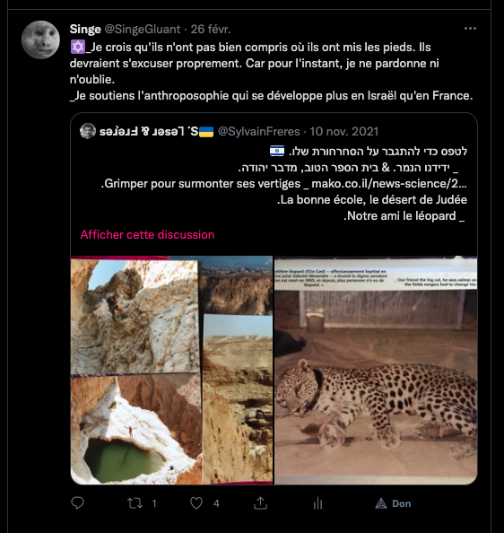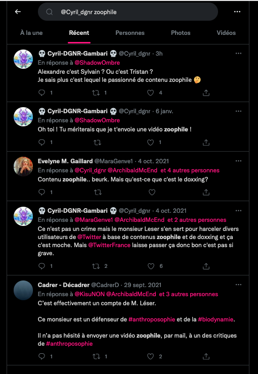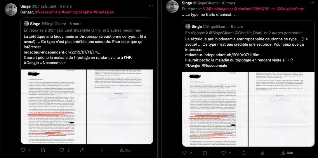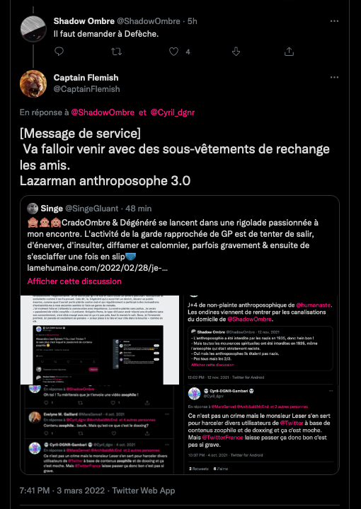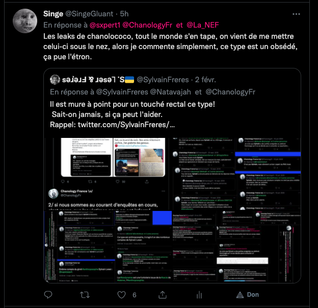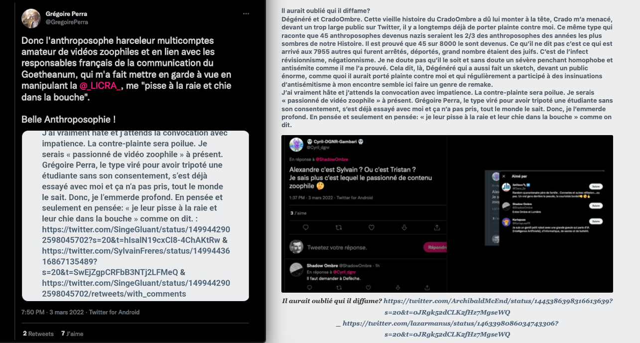J’ai vraiment hâte et j’attends la convocation avec impatience. La contre-plainte sera poilue. Je serais « passionné de vidéo zoophile » à présent. Grégoire Perra, le type viré pour avoir tripoté une étudiante sans son consentement, s’est déjà essayé avec moi et ça n’a pas pris, tout le monde le sait. Donc, je l’emmerde profond. En pensée et seulement en pensée: « je leur pisse à la raie et leur chie dans la bouche » comme on dit. : https://twitter.com/SingeGluant/status/1499442902598045702?s=20&t=hIsalN19cxCl8-4ChAKtRw & https://twitter.com/SylvainFreres/status/1499443616867135489?s=20&t=SwEjZgpCRFbB3NTj2LFMeQ & https://twitter.com/SingeGluant/status/1499442902598045702/retweets/with_comments