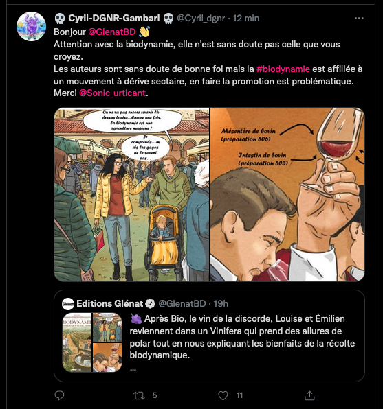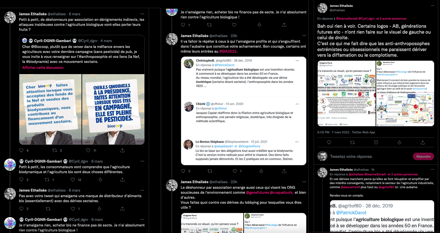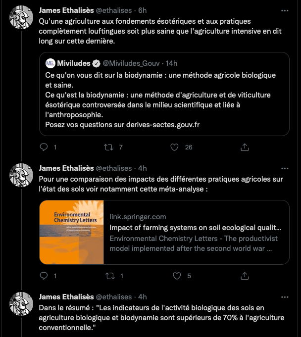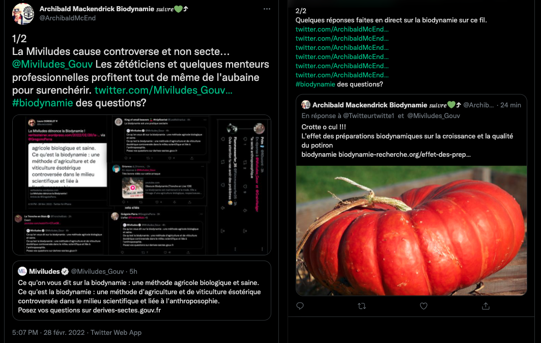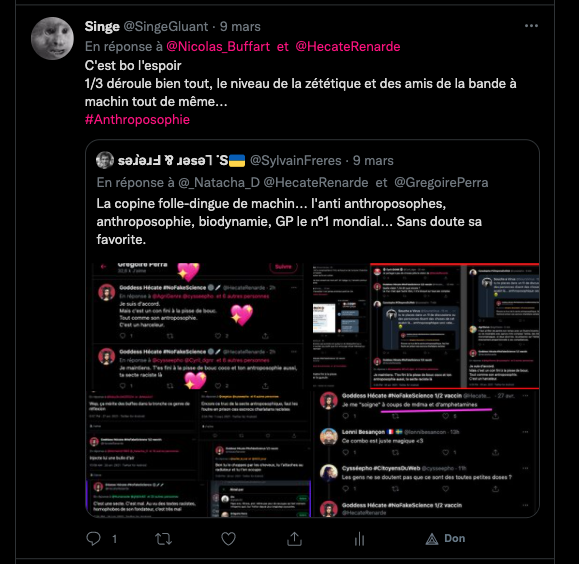 En cours : https://twitter.com/ArchibaldMcEnd/status/1498328948597571584?s=20&t=C8nb45mcOnGHxpCKJlmKSQ & https://twitter.com/ArchibaldMcEnd/status/1498328945896394761?s=20&t=C8nb45mcOnGHxpCKJlmKSQ & Suivre Tweets et réponses : https://twitter.com/ArchibaldMcEnd/with_replies – Les attaques conte la biodynamie et l’anthroposophie sont parfois très graves, insultes, diffamations, fausses informations à charge sur des personnes, et parfois c’est juste de la critique infondée Février fut très violent! Je m’adapte à qui j’ai en face https://twitter.com/ArchibaldMcEnd/status/1498332009533513736?s=20&t=C8nb45mcOnGHxpCKJlmKSQ & La zététique est une secte, beurk Luttons contre !