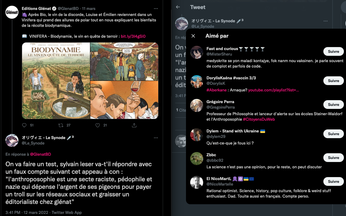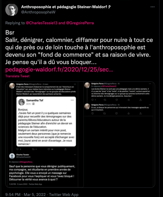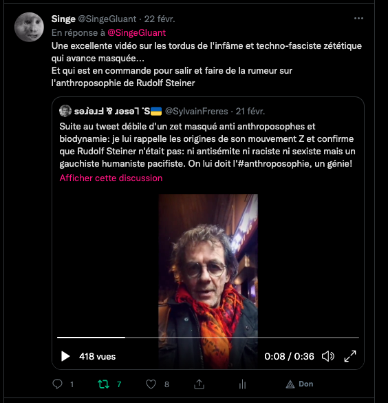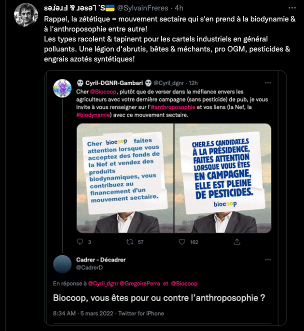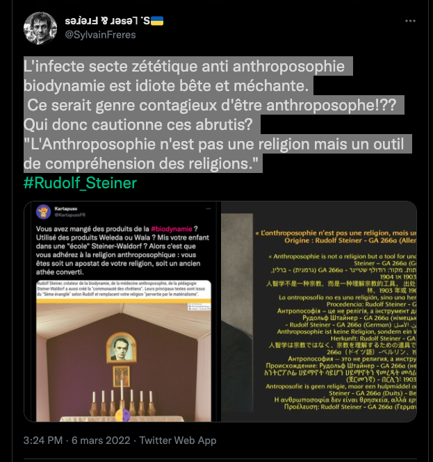 VARIANTE : Prononcer le mot anthroposophie, biodynamie, avoir ouvert un bouquin de Rudolf Steiner, se mettre du déo Weleda, et vous êtes de facto anthroposophe pour la junte milicienne diligentée par GP. Et, c’est pas reluisant d’en être un sur les réseaux sociaux. https://twitter.com/SylvainFreres/status/1500848076839395328?s=20&t=sSgd0UEHdcgjNEOQMCkr-g
