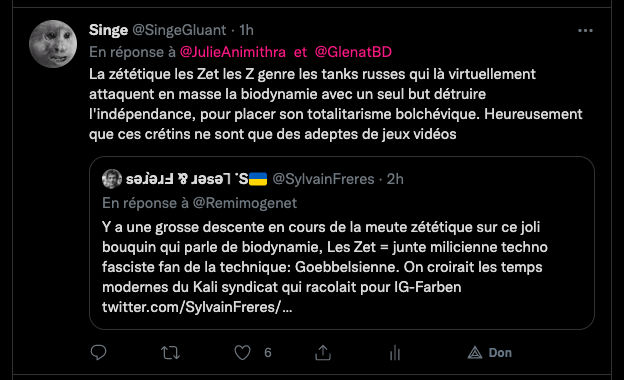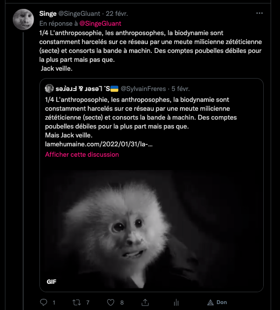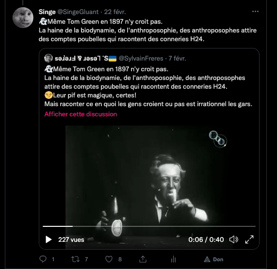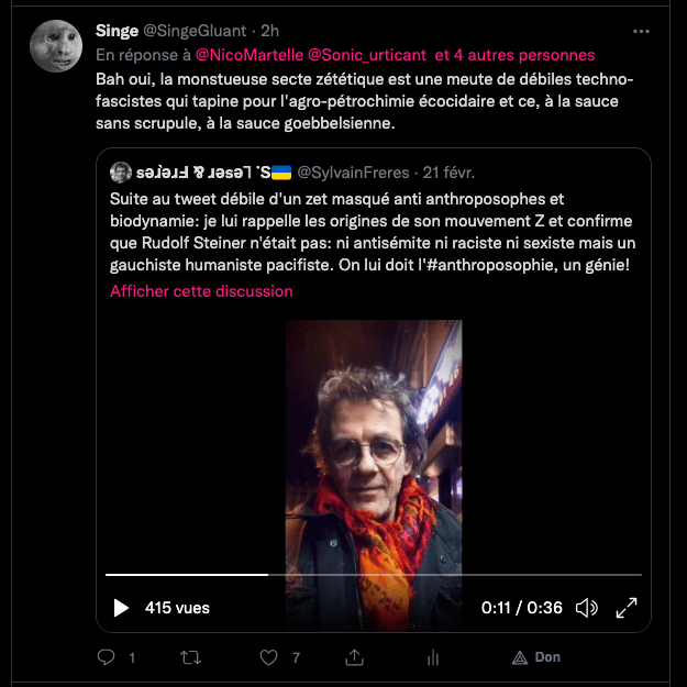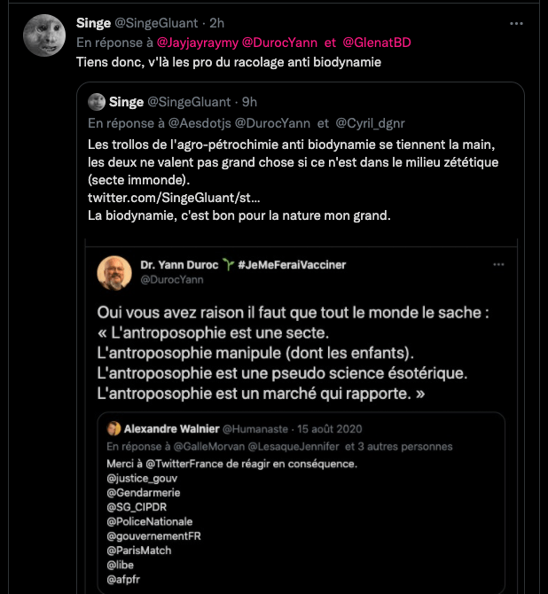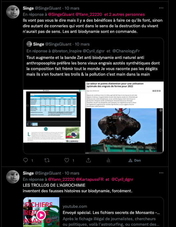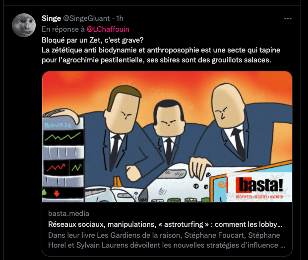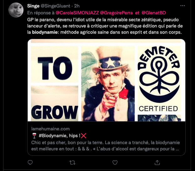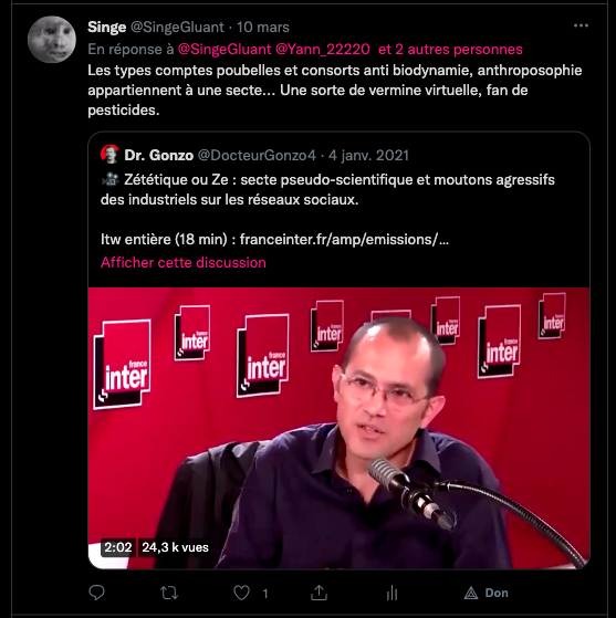 – En effet mais depuis que tu fais des allégations fallacieuses, sur la biodynamie et l’anthroposophie et ça fait longtemps. Tu es connu et reconnu comme un activiste zététicien, pro OGM, pesticides qui racole pour les cartels industriels pollueurs. #Vomir https://twitter.com/SingeGluant/status/1500548933927456780?s=20&t=hOTim3ZXR1Ped4bXd61JPQ &