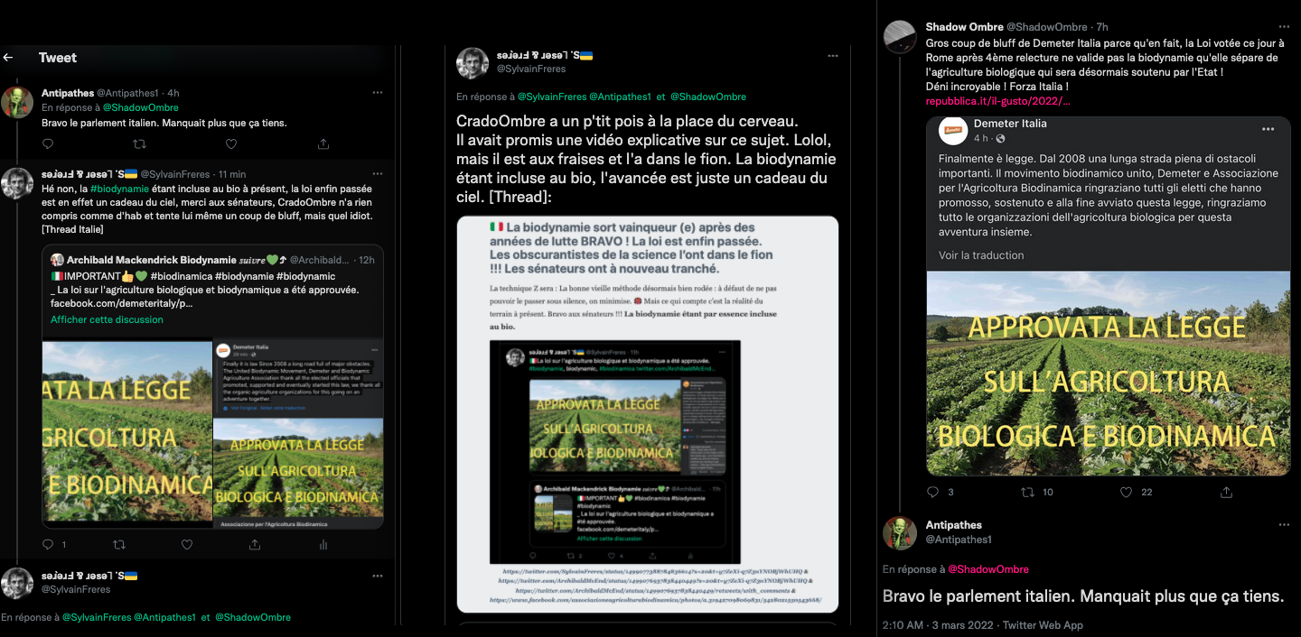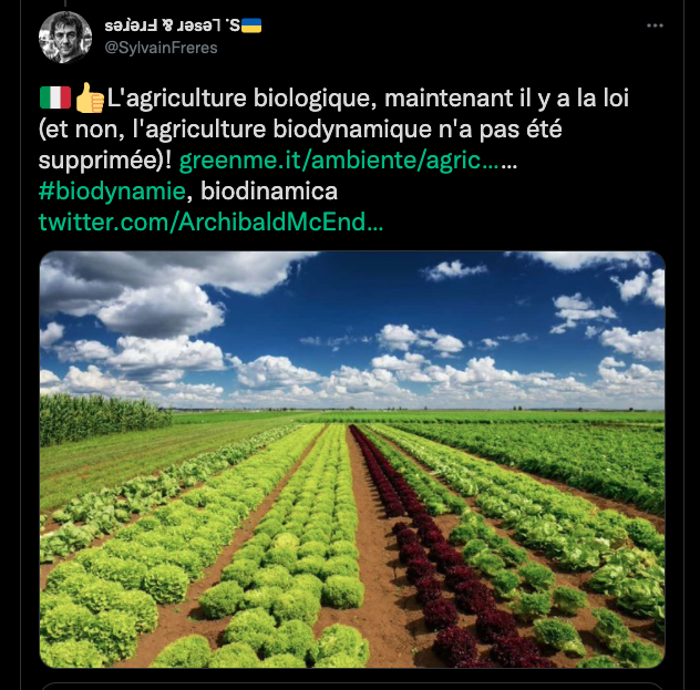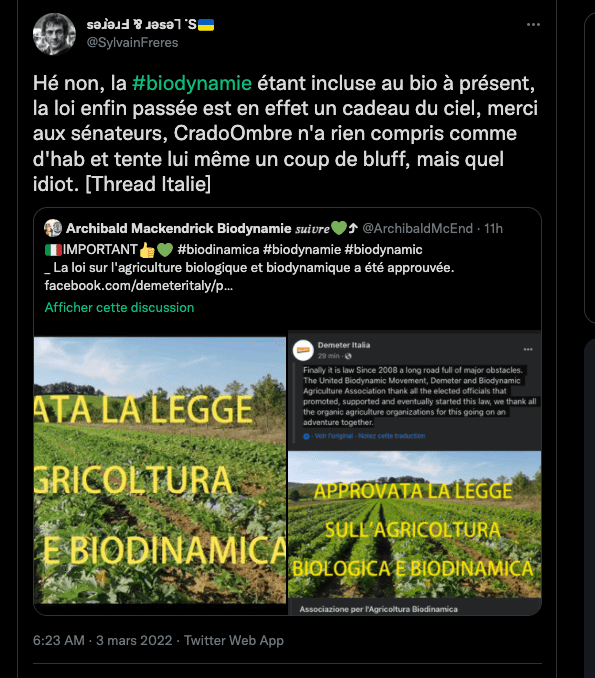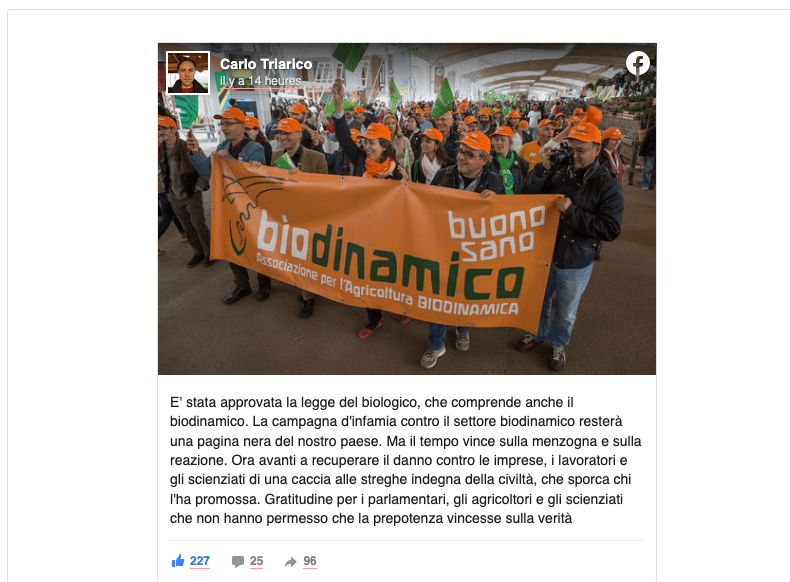 Important : La loi du biologique, qui comprend aussi la biodynamie, a été votée. La campagne d’infamie contre la filière biodynamique restera une page noire de notre pays. Mais le temps l’emporte sur le mensonge et la réaction. Passons maintenant à la réparation des dommages subis par les entreprises, les travailleurs et les scientifiques d’une chasse aux sorcières indigne de la civilisation, sale qui l’a encouragée. Gratitude aux députés, aux agriculteurs et aux scientifiques qui n’ont pas permis au fanatisme de l’emporter sur la vérité : https://twitter.com/ArchibaldMcEnd/status/1499307984480092161?s=20&t=OmCtSYR3BCGtGKBLaqvRgQ & https://www.facebook.com/carlo.triarico/posts/10227720193580763