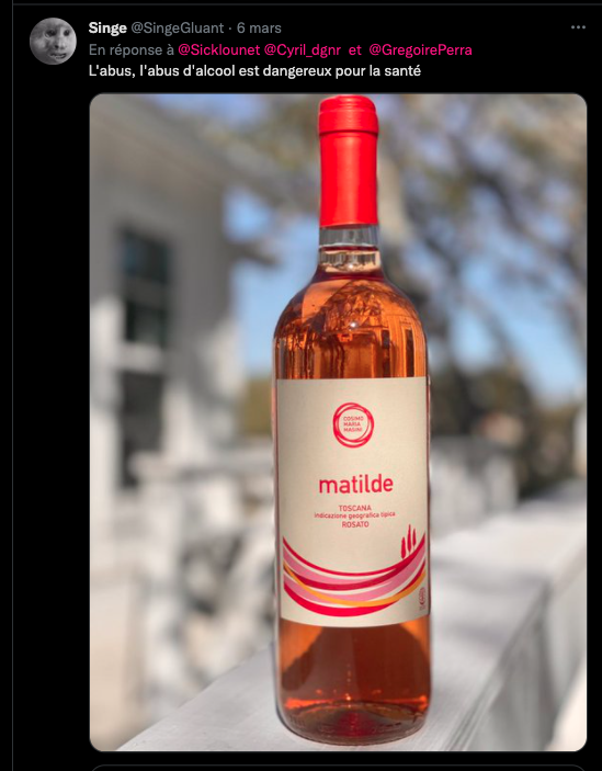 _ Variante : Pète un coup mec ! La zététique est ce qu’elle est, un nid d’ordures ! _ Avec les beaux jours et les températures des années 80, la saison des rosés est arrivée ! https://twitter.com/SingeGluant/status/1500407644833685506?s=20&t=cpTBhczUYphzOpESiUxT8A – L’abus, l’abus d’alcool est dangereux pour la santé https://twitter.com/SingeGluant/status/1500436539020611584?s=20&t=uwWoofcDCjkMDgDS5YQ2ew – Pourtant la secte zététique qui racole pour les pollueurs est dangereuse, ils en sont tous sur ce fil. Pesticides et compagnies… https://twitter.com/SingeGluant/status/1500446703924752385?s=20&t=7-Ing9QJ9RO7maG9Bx-GGA