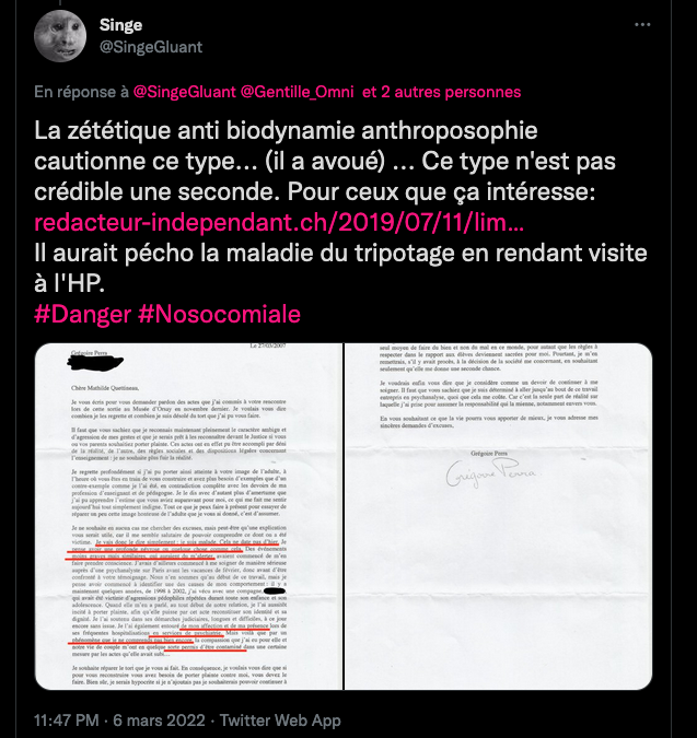 La zététique anti biodynamie anthroposophie cautionne ce type… (il a avoué) … Ce type n’est pas crédible une seconde. Pour ceux que ça intéresse: https://redacteur-independant.ch/2019/07/11/limposture-gregoire-perra/… Il aurait pécho la maladie du tripotage en rendant visite à l’HP. #Danger #Nosocomiale https://twitter.com/SingeGluant/status/1500604046624927752?s=20&t=a48PWA6zam3k90TA9dUxkQ & https://twitter.com/SingeGluant/status/1500604456752328710?s=20&t=a48PWA6zam3k90TA9dUxkQ & https://twitter.com/SingeGluant/status/1500605659750010893?s=20&t=_nCtnAlbb41LdoodtNg9Cg