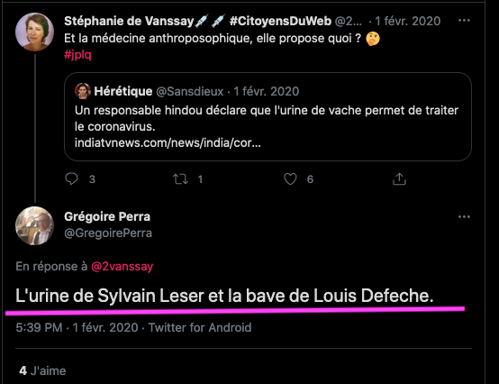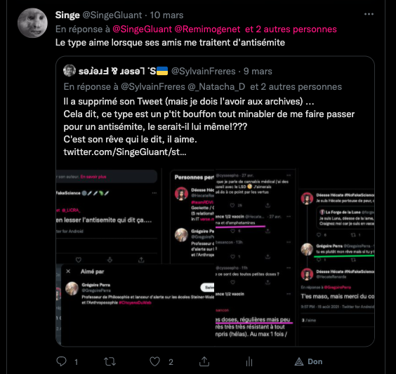 _ G.P 🐀 n’aime pas la biodynamie ni l’anthroposophie dis donc… https://twitter.com/RatSongeur/status/1502776501216980994?s=20&t=44TtZAV2LMU9Woj8h_q92w – Tu me renifles encore le derche dis donc!?? https://twitter.com/RatSongeur/status/1502781611510833157?s=20&t=44TtZAV2LMU9Woj8h_q92w – Que tu n’aurais pas du me traiter d’antisémite! https://twitter.com/RatSongeur/status/1502783861775818758?s=20&t=44TtZAV2LMU9Woj8h_q92w –