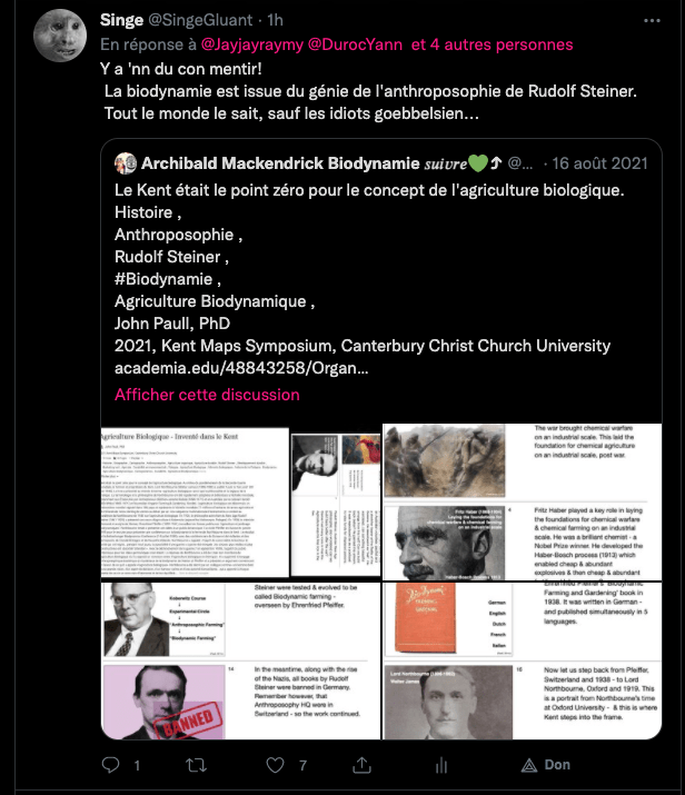 @GlenatBD Vous subissez une attaque d’astroturfing de la communauté zététique (secte qui tapine pour l’agro-industrie)…et qui n’aime pas la belle et intelligente #biodynamie… https://twitter.com/SingeGluant/status/1502649703166586882?s=20&t=Z24BDgZXFqxd11MJnVE5nA , Tu appelles le raciste paranoïaque de la secte zététique anti biodynamie ? https://twitter.com/LazarmanT/status/1502650592858193924?s=20&t=819KfBcKvGK0vNjjF3cpBA , Tu dis de la merde sur la biodynamie, tu préfères l’agriculture intensive qui se sert de l’eau des chiottes et des pesticides pour nourrir son peuple? https://twitter.com/LazarmanT/status/1502651376702304259?s=20&t=819KfBcKvGK0vNjjF3cpBA & https://twitter.com/LazarmanT/status/1502652138937331712?s=20&t=oZP76-OTUDg2MOQcUfYaJA &