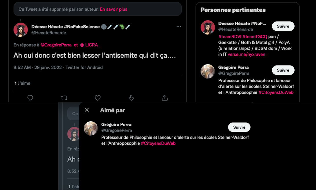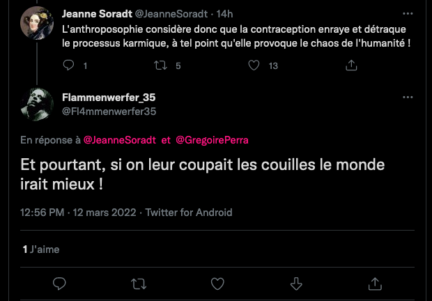L’ignoble troll @JeanneSoradt qui me traite d’antisémite (et que GP cautionne) et qui mériterait 12.000 en diffamation, est, pour qu’on coupe les couilles aux anthroposophes. La zététique est un nid d’immondes porcs… https://twitter.com/SingeGluant/status/1501885516689588229?s=20&t=Pkcu8AR6CH3xzhdoh-UoYg