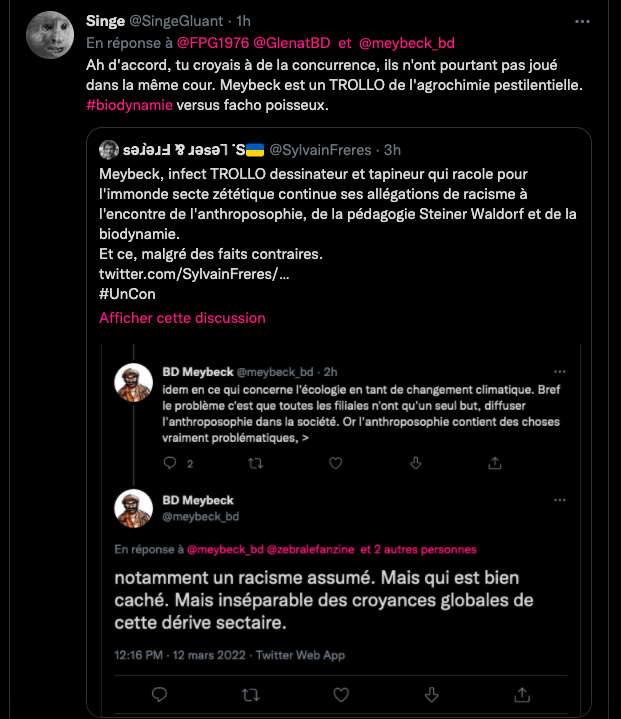 _ Les trollos de l’agro-pétrochimie anti biodynamie se tiennent la main, les deux ne valent pas grand chose si ce n’est dans le milieu zététique (secte immonde). https://twitter.com/SingeGluant/status/1496886289312157696?s=20&t=-J3sD_axkjZQPO9mhIBPmg… La biodynamie, c’est bon pour la nature mon grand. https://twitter.com/SingeGluant/status/1502559262635134979?s=20&t=_opcKPn8BpB4JxvORVdjmA … La zététique est raciste dans ses fondations, l’anthroposophie en est le contraire. https://twitter.com/ArchibaldMcEnd/status/1502611412459347969?s=20&t=3vddoUXsseCq6Htem03jEA – Toi tu es facho++ qui raconte des choses dignes des nazis, même réthorique goebbelsienne. https://twitter.com/SingeGluant/status/1502614351827582980?s=20&t=Ox9NHSTfByXuN0ihpdDcZQ Le porc n’est jamais loin… Meybeck, infect TROLLO dessinateur et tapineur qui racole pour l’immonde secte zététique continue ses allégations de racisme à l’encontre de l’anthroposophie, de la pédagogie Steiner Waldorf et de la biodynamie. Et ce, malgré des faits contraires. https://twitter.com/SylvainFreres/status/1502642884062986241?s=20&t=K–2oz9ehUzuRGKEYfig3A