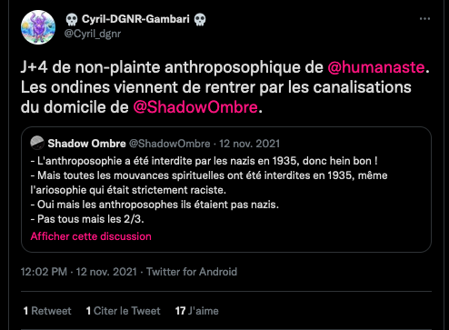 Dégénéré et CradoOmbre. Cette vieille histoire du CradoOmbre a dû lui monter à la tête, Crado m’a menacé, devant un trop large public sur Twitter, il y a longtemps déjà de porter plainte contre moi. Ce même type qui raconte que 45 anthroposophes devenus nazis seraient les 2/3 des anthroposophes des années les plus sombres de notre Histoire. Il est prouvé que 45 sur 8000 le sont devenus. Ce qu’il ne dit pas c’est ce qui est arrivé aux 7955 autres qui furent arrêtés, déportés, grand nombre étaient des juifs. C’est de l’infect révisionnisme, négationnisme. Je ne doute pas qu’il le soit et sans doute un sévère penchant homophobe et antisémite comme il me l’a prouvé. Cela dit, là, Dégénéré qui a aussi fait un sketch, devant un public énorme, comme quoi il aurait porté plainte contre moi et qui régulièrement a participé à des insinuations d’antisémitisme à mon encontre semble ici faire un genre de remake.