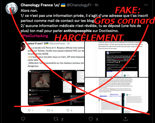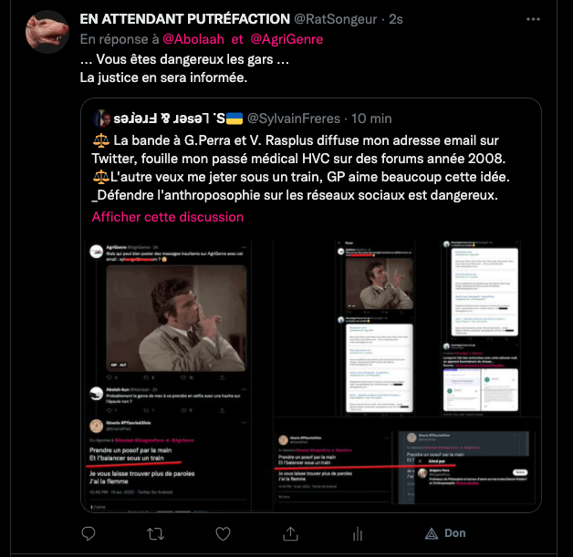 L’abruti DĂ©gĂ©nĂ©rĂ© qui avait soit-disant portĂ© plainte (qu’il va regretter si c’est vrai) contre moi continue de causer de moa pour me nuire publiquement, lĂ , il participe Ă du doxxing et du harcĂšlement sĂ©rieux… Les types, aprĂšs avoir diffusĂ© mon email et tentant d’Ă©plucher mon passĂ© mĂ©dical HVC veulent me salir racontant que je serais payĂ©. Le juge, le procureur et surtout mon avocat, vont bien rigoler.
