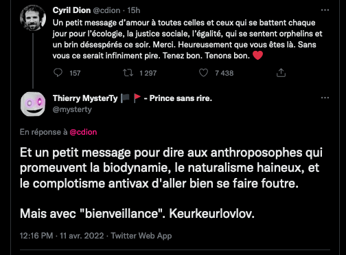 _ Ni l’un ni l’autre n’y connaissent quoi que ce soit en anthroposophie ni en biodynamie, ces types sont en plus: trĂšs trĂšs malsain… et quant Ă toi   https://twitter.com/MandrakeCagoule/status/1513254991124963332?s=20&t=1FVruAHQkFq_rWlBlJFZFg