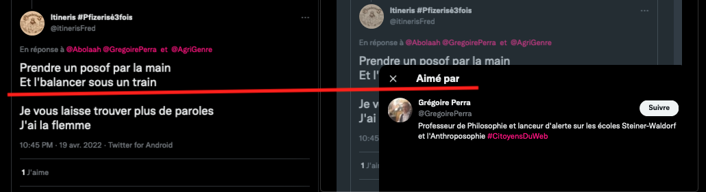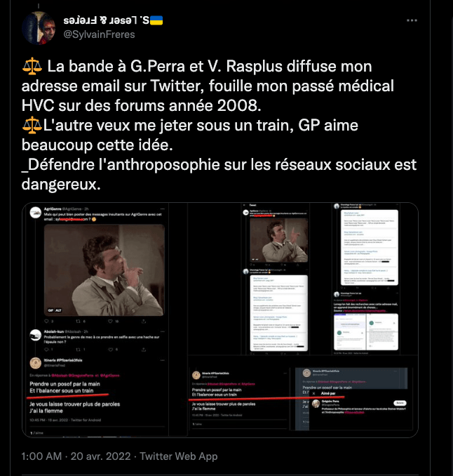 _ Nouvelle complainte de l’anti anthroposophie n° 1, qui cautionne des types qui font des menaces de reprĂ©sailles avĂ©rĂ©es ou des allĂ©gations gravissimes, dont il jubile. Mais on sent bien lĂ qu’il va voter M’dĂšme machin.. Rappel 1 & 2 https://twitter.com/SylvainFreres/status/1514343444940050439?s=20&t=XyZrWxSq7aQ_7sFLRwcTTA
