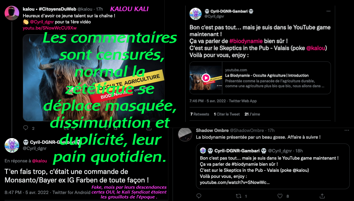 Les anti biodynamie, anthroposophie. Cautionner la zététique? et la bande à machin? qui se croient tout permis. Les menaces, toujours de plus en plus graves, laides et salles. Mais que font ceux censés réguler la haine sur internet!??https://twitter.com/ArchibaldMcEnd/status/1516823072925532160?s=20&t=yBIHvXkjL7RamZnfBYIUQw
