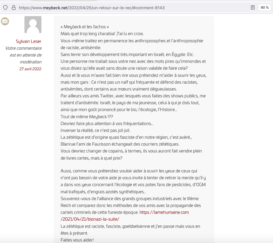 En gros, j’attends des excuses officielles de Meybeck, pour ses allĂ©gations honteuses de racisme et d’antisĂ©mitisme Ă l’encontre de l’anthroposophie, qui se dĂ©veloppe plus en IsraĂ«l qu’en France. https://twitter.com/SylvainFreres/status/1510195689950789635?s=20&t=hWkEGx1xLiDfsP65oJ6uSw & C’est la face cachĂ©e de l’agrochimie son bouquin qui raconte des Ăąneries sur la biodynamie https://twitter.com/SylvainFreres/status/1510204113228861442?s=20&t=hWkEGx1xLiDfsP65oJ6uSw & Il a forcĂ©ment des trucs Ă cacher ce type masquĂ© qui raconte que l’anthroposophie avance masquĂ©e đ€Ł https://twitter.com/SylvainFreres/status/1510212397151277057?s=20&t=qgCeyhfNNyXiwj358hE85Q