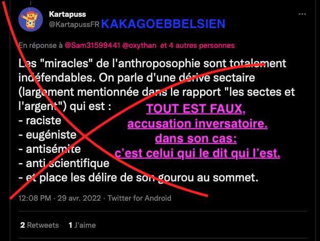La p’tite sous merde : Ce que dit KakaGoebbelsien est faux. Et c’est gravement sale d’ailleurs. L’anthroposophie n’est pas une secte, pas eugĂ©niste, pas raciste, pas antisĂ©mite et pas anti science. En revanche lui est, tout cela. C’est pour cela qu’il se cache. https://lamehumaine.com/2020/07/13/rudolf-steiner-en-terre-sainte/ & https://twitter.com/lazarmanus/status/1519994960656928768?s=20&t=8SwS4wyeR49X1yHt-2RqWw & https://twitter.com/lazarmanus/status/1519995187409338369?s=20&t=8SwS4wyeR49X1yHt-2RqWw