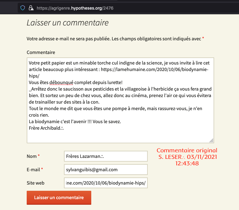 Lazarman team reçoit des emails spam bizarres d’AgriGlauqueZetâŽ, qui trafique les commentaires sur son site, ce type ment, triche et frĂ©quente les pires trolls du web.