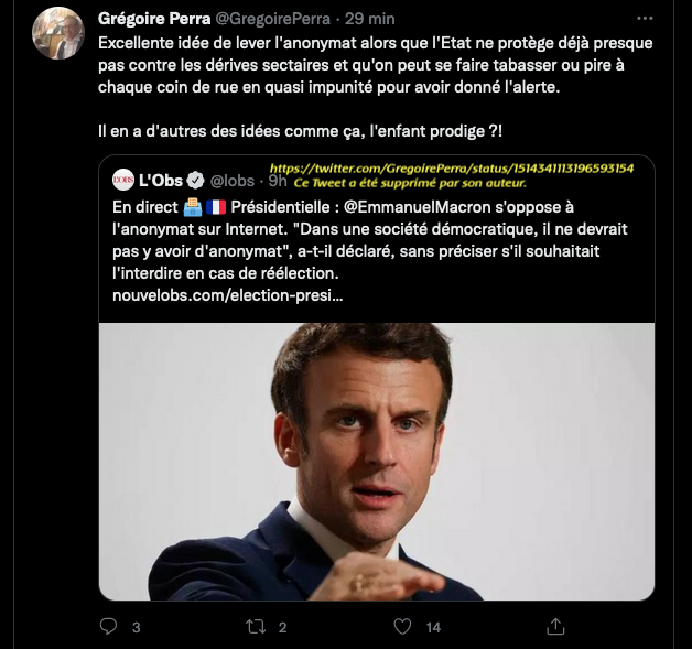 L’idiot Rasplus : https://twitter.com/lazarmanus/status/1519683073557807105?s=20&t=k1l7BAhdYma6TY_YTIt96A & https://twitter.com/lazarmanus/status/1519681802171998211?s=20&t=ofeyO6Ml1ucvceZrr541FQ & https://twitter.com/lazarmanus/status/1519681984481882113?s=20&t=ofeyO6Ml1ucvceZrr541FQ