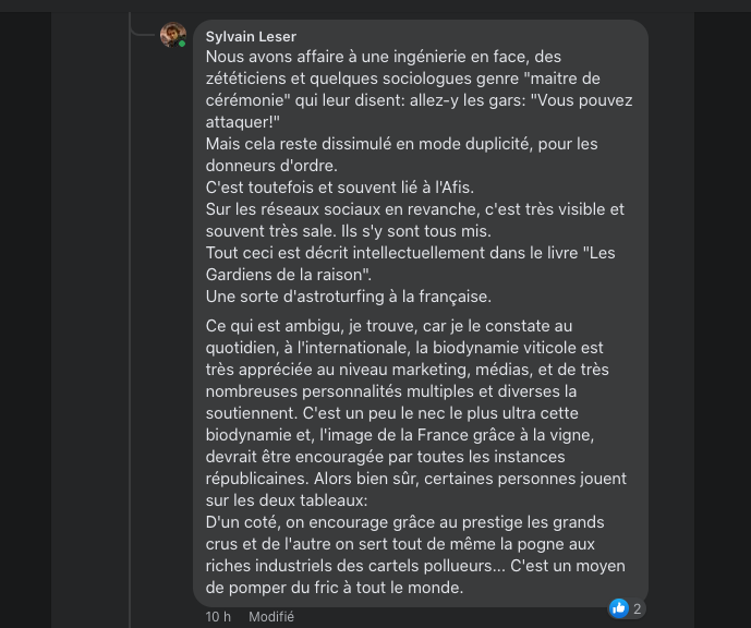 Reichard Von Moisi : C’est normal, lui comme toi racontez des conneries non stop sur la biodynamie et montrez vos intĂ©rĂȘts respectifs Ă tenter lui nuire. Mais vous vous ĂȘtes gaufrĂ©s, du vin sans gnomes, plus personne n’en veut. https://twitter.com/SylvainFreres/status/1511611161833357317?s=20&t=aeeP6dhB6ZFU62t58BJEYQ Reichard Von Moisi admet se torcher avec la science et admet aussi qu’il est un On de on en parle mais qui donc en parle, admet-t-il avoir des liens avec l’agro-industrie via l’immonde zĂ©tĂ©tique? MĂ©ta-analyse : impact positif de la biodynamie . https://twitter.com/SylvainFreres/status/1511613691711705089?s=20&t=SHy7pmT6l6aslmhpZ33CEA