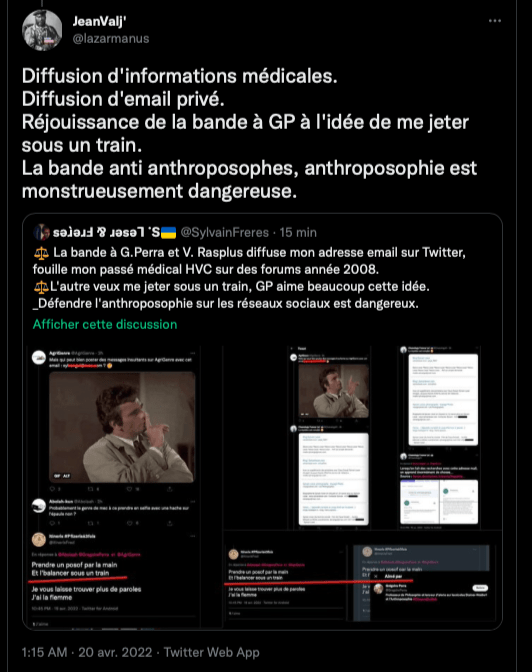 En plus cette meute anti anthroposophie adore se faire passer pour victime, les techniques de cette engeance sont sordides, rumeur noire, propagande. Tout ce qu’ils reprochent aux autres, mais alors tout, c’est d’eux qu’il s’agit. Le mois d’avril, vu de ma fenĂȘtre https://twitter.com/Zobologue/status/1519941439924359169?s=20&t=JHlCdkMgfNOXcq-OELACJg & L’anti anthroposophie, anthroposophes, biodynamie: les fameux pseudo sceptiques zĂ©tĂ©ticiens s’entre dĂ©chirent dans leur salon #RECtlse22: blagues racistes, antisĂ©mites, psychophobes et extrĂȘme droite. C’est pas joli. Dire que certains les cautionnent.. https://twitter.com/Zobologue/status/1519933505014280193?s=20&t=JHlCdkMgfNOXcq-OELACJg , https://twitter.com/SylvainFreres/status/1519982635350642689?s=20&t=zG7nCKEKtbUgnit-hrp_9g