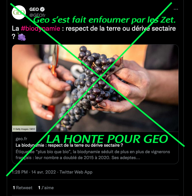 !!! #LaHonte. https://twitter.com/LaFactur/status/1514635157705220100?s=20&t=R87IvESKrCLgwZV_PeWi9w – Ăh oui, la #biodynamie ,depuis son tout dĂ©but, lutte contre les consĂ©quences sordides de l’agrochimie ! Ce qui aujourd’hui gĂšne l’agro-industrie… Mais GEO qui leur donne la soupe c’est surprenant, non? https://twitter.com/LaFactur/status/1514636844981489671?s=20&t=56_zvYDJTrgYqYTSEvXSDA – ForcĂ©ment quand @GEOfr