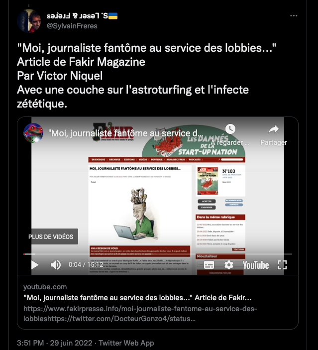 Super ce droit de réponse. Ce serait bien de mettre le communiqué sur votre site, histoire de ne pas avoir à se retaper la lecture et de faire la promo de cet infâme torchon. https://twitter.com/AnthroposopheW/status/1542079591585554436?s=20&t=HMwbX6FZxmxJA6Q8qIqP8Q