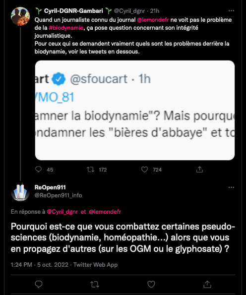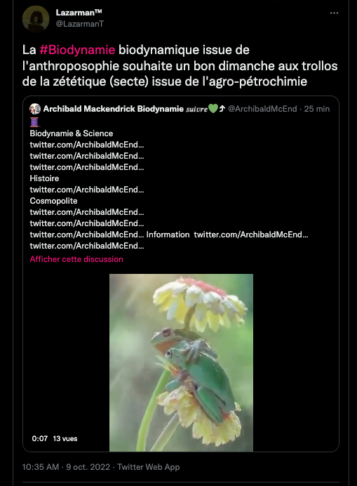Quelques réponses supplémentaires: Très rigolo tout ça mais ça ne concerne pas la science La biodynamie est harcelée par des trollos proche de l’agro-pétrochimie pestilentielle. https://twitter.com/RatSongeur/status/1577618768875995137?s=20&t=yszhw7ZPFIDYpu9xGpQ5vA & https://twitter.com/ceintogust1/status/1577373791054872582?s=20&t=C7NSxzFjSmyLw12CvOIScg & https://twitter.com/ReOpen911_info/status/1577620741868191745?s=20&t=T-IWiDDvO9vv9L-uLjRb_A