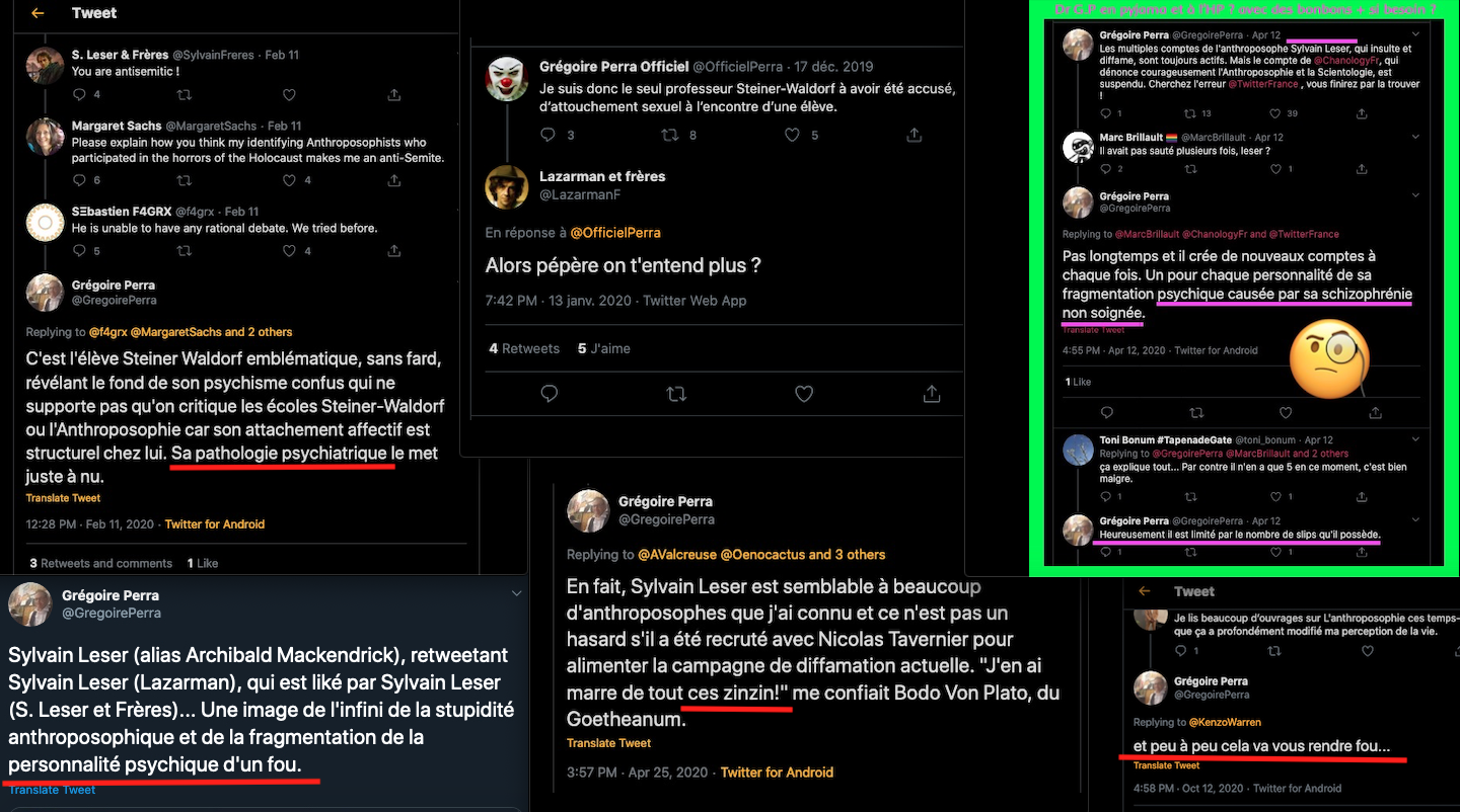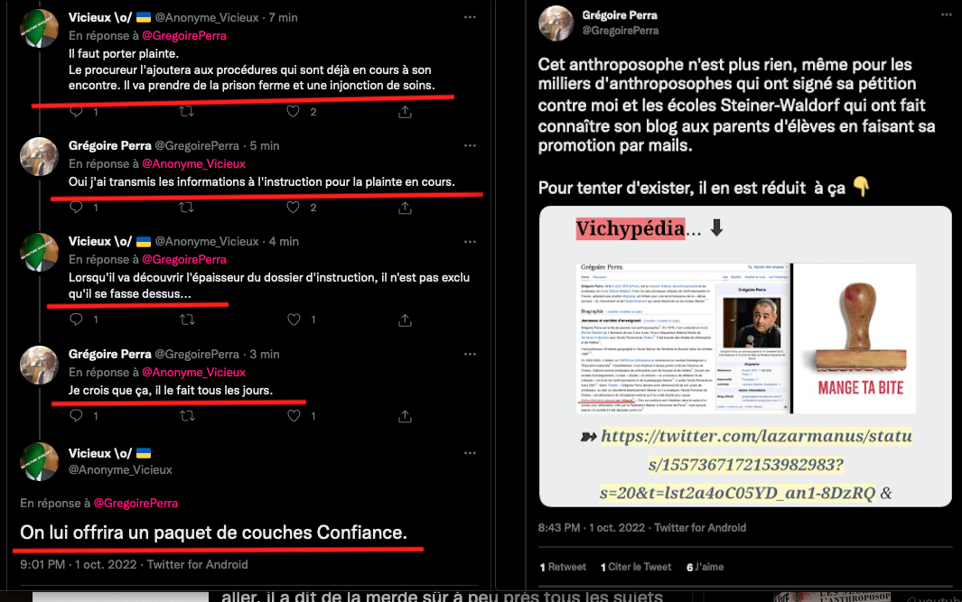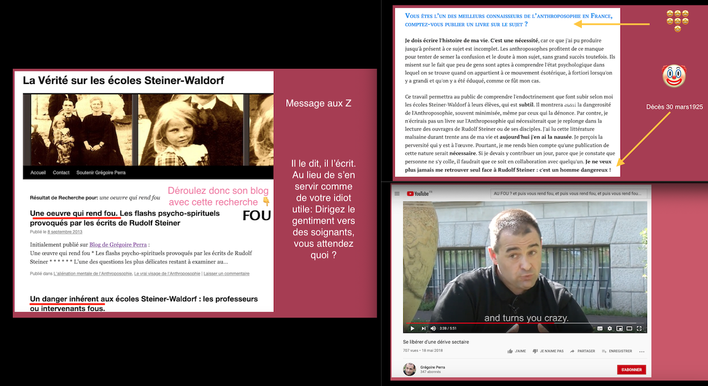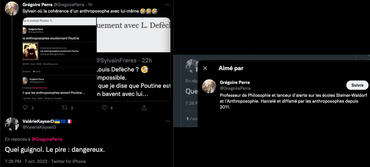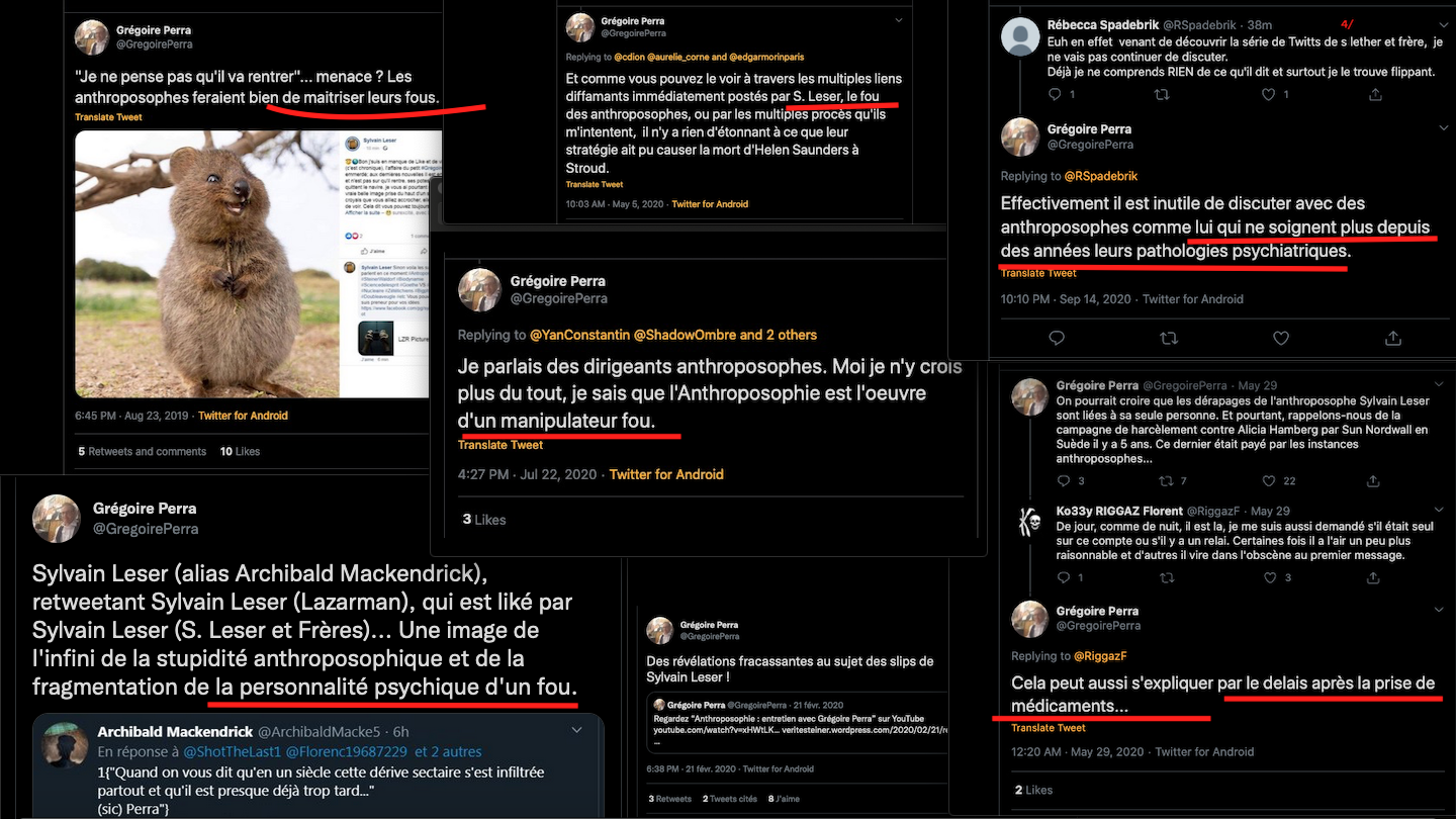 Lire : https://lamehumaine.com/2022/08/30/les-milice-z-et-consorts-anti-anthroposophes-anthroposophie-de-la-rentree/… Perra est adepte d’encourager les menaces à mon encontre, certaines sont gravissimes : https://twitter.com/Zobologue/status/1516831993920880640?s=20&t=h6bQeLS7lRJQpbkmqqIODA & https://twitter.com/LaFactur/status/1389145997566259201?s=20&t=EEBmsWS03WFRAAL-tFwH8A (non exhaustif.)